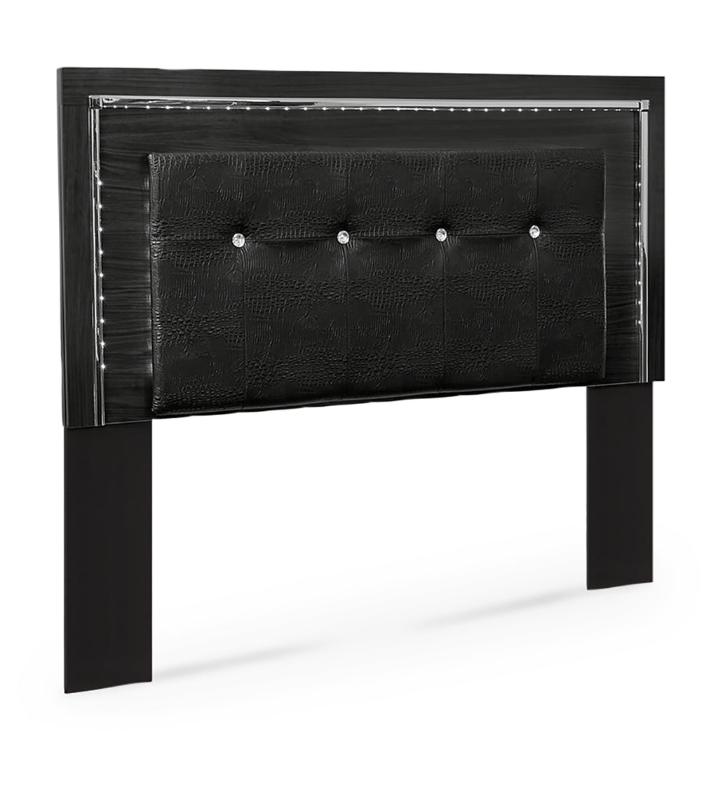 Rest easy. The luxurious look you’ve been dreaming of is yours for the taking, at a price sure to put you at ease. This upholstered headboard brings a sense of old Hollywood with a contemporary flair. A deep, dark finish, faceted chrome-tone accents and LED lighting exude Hollywood-chic style to the max. Padded windowpane stitching on the sleek, black upholstery infuses a sumptuous look that’s upscale and indulgent, and utterly on trend. A wireless remote allows you to control the color and brightness to suit the mood. | Product Features