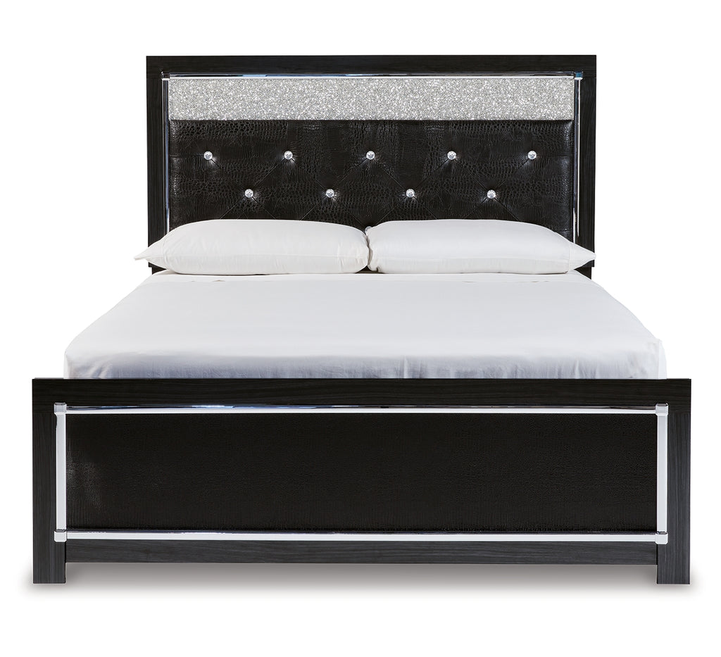 Rest easy. The luxurious look you’ve been dreaming of is yours for the taking, at a price sure to put you at ease. This queen upholstered panel platform bed brings a sense of old Hollywood with a contemporary flair. A deep, dark finish, faceted chrome-tone accents and LED lighting exude Hollywood-chic style to the max. Padded windowpane stitching on the sleek, black upholstery infuses a sumptuous look that’s upscale and indulgent, and utterly on trend. A wireless remote allows you to control the color and brightness to suit the mood. | Product Features