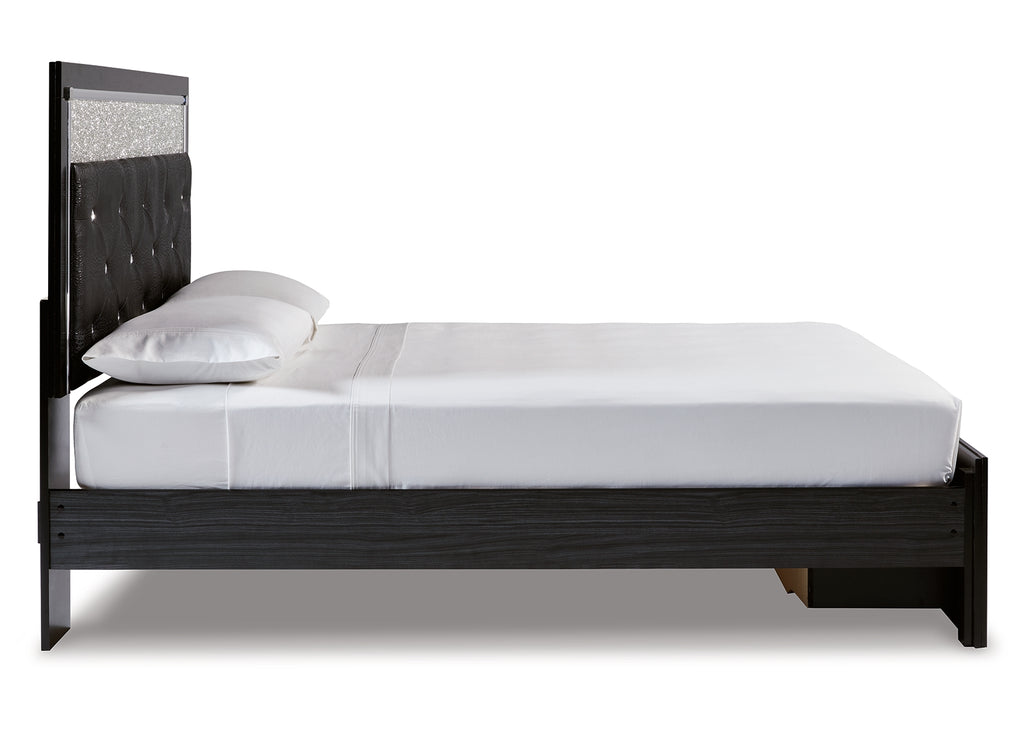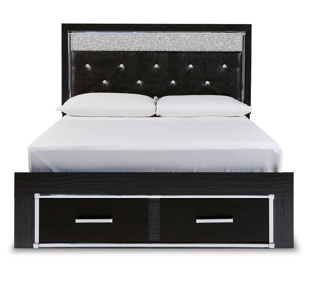 Rest easy. The luxurious look you’ve been dreaming of is yours for the taking, at a price sure to put you at ease. This queen upholstered panel bed with storage brings a sense of old Hollywood with a contemporary flair. A deep, dark finish, faceted chrome-tone accents and LED lighting exude Hollywood-chic style to the max. Padded windowpane stitching on the sleek, black upholstery infuses a sumptuous look that’s upscale and indulgent, and utterly on trend. Double drawers at the foot of the bed provide space-saving storage. | Product Features