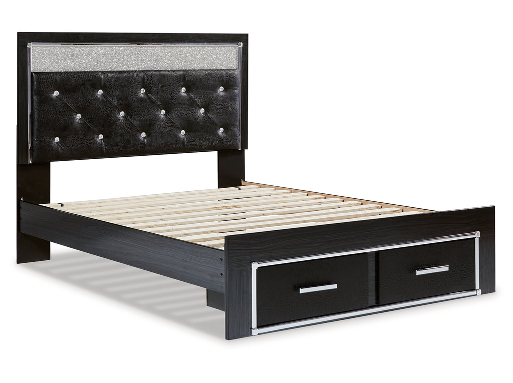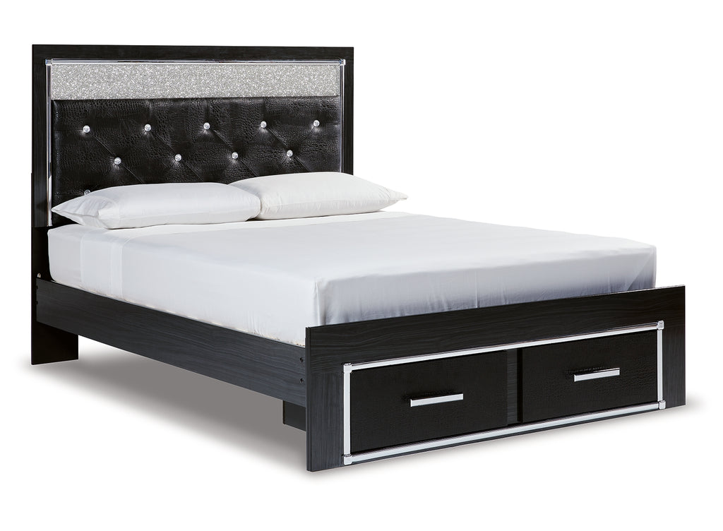 Rest easy. The luxurious look you’ve been dreaming of is yours for the taking, at a price sure to put you at ease. This queen upholstered panel platform bed brings a sense of old Hollywood with a contemporary flair. A deep, dark finish, faceted chrome-tone accents and LED lighting exude Hollywood-chic style to the max. Padded windowpane stitching on the sleek, black upholstery infuses a sumptuous look that’s upscale and indulgent, and utterly on trend. Double drawers at the foot of the bed provide space-saving storage. | Product Features