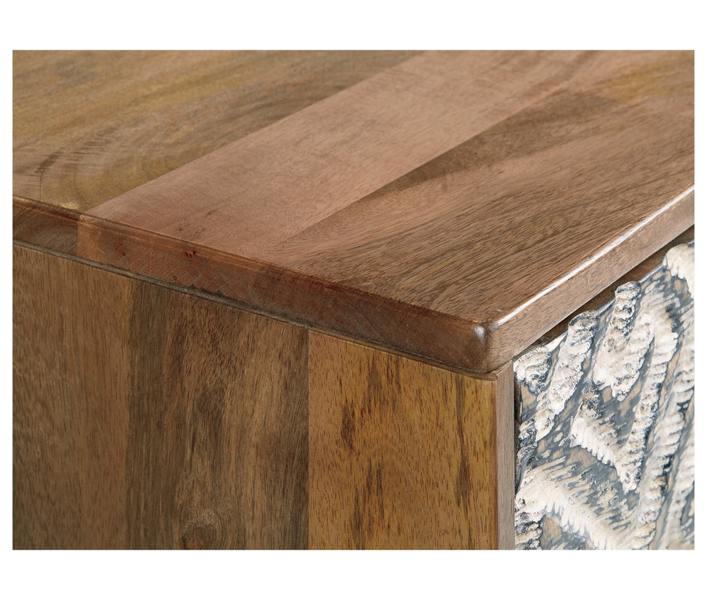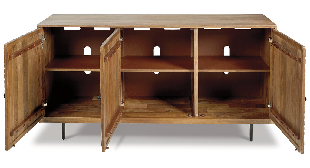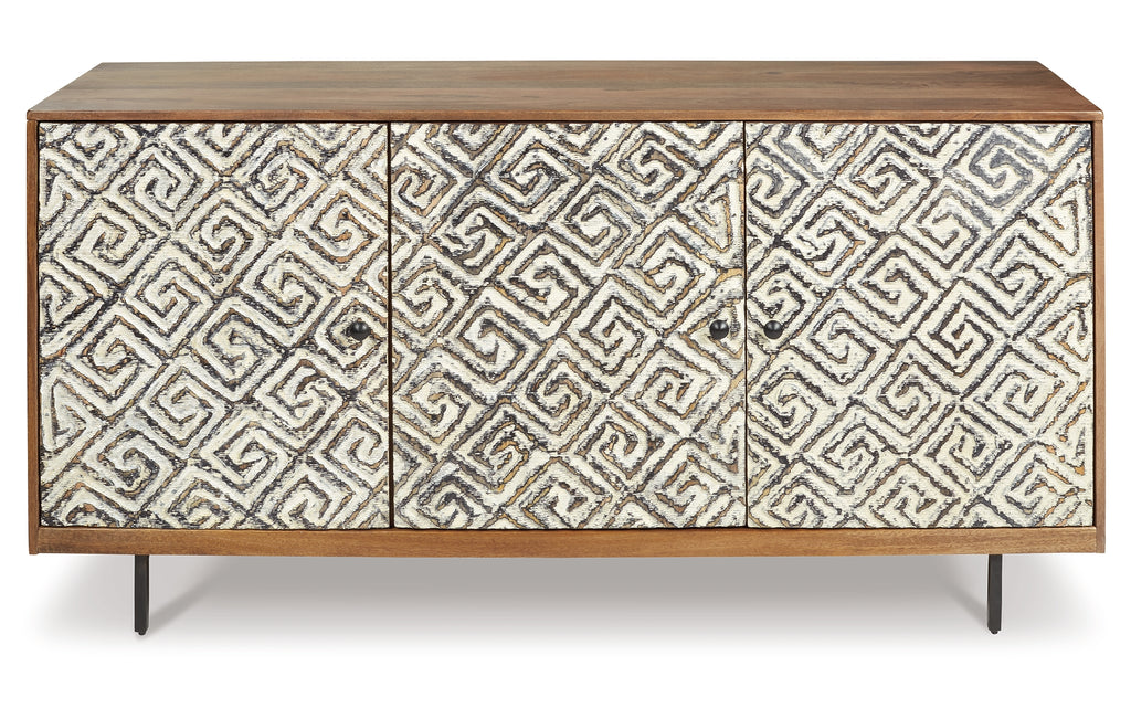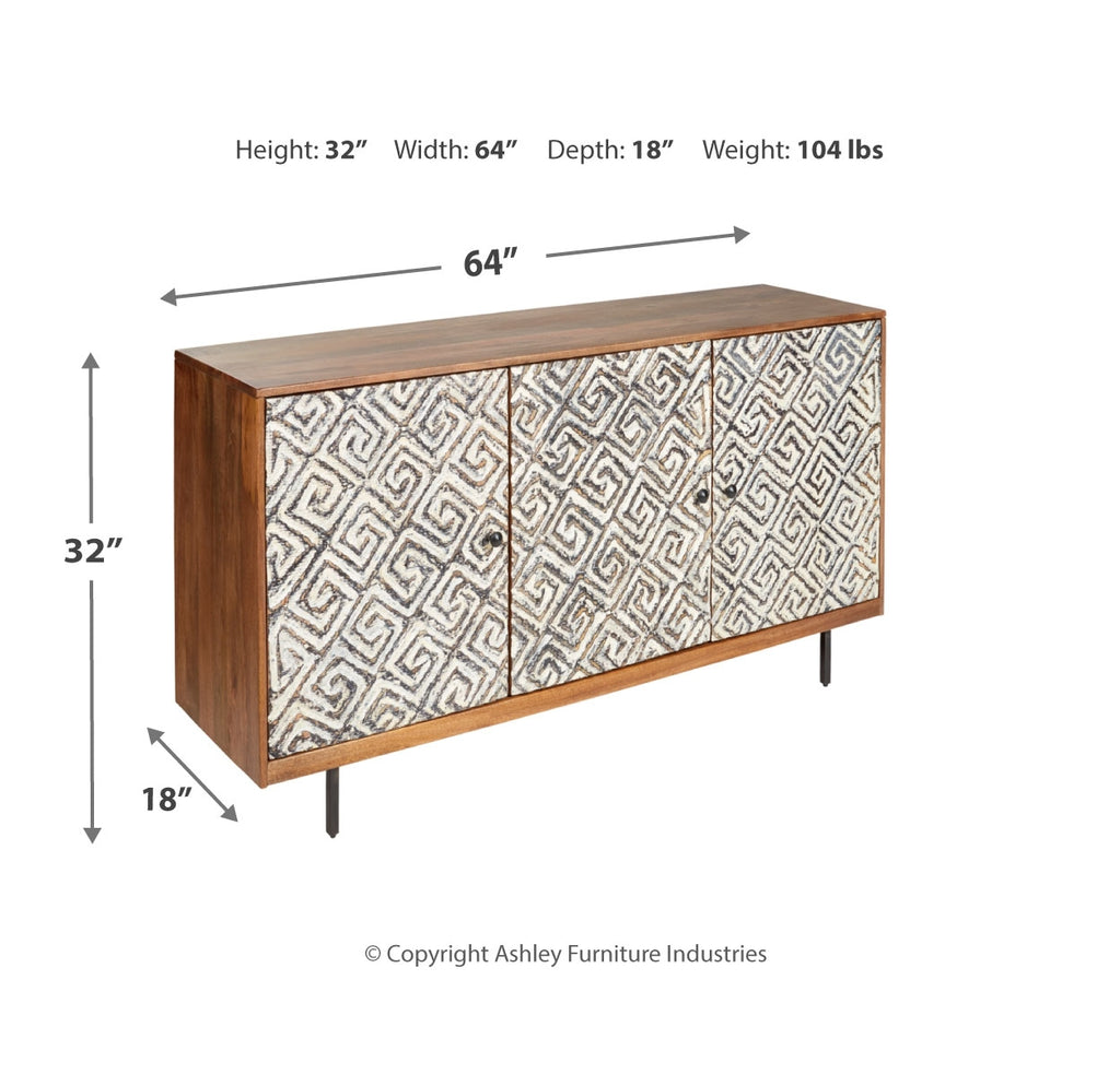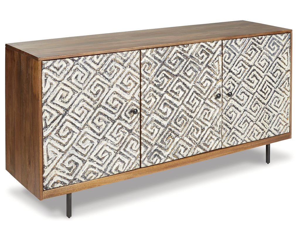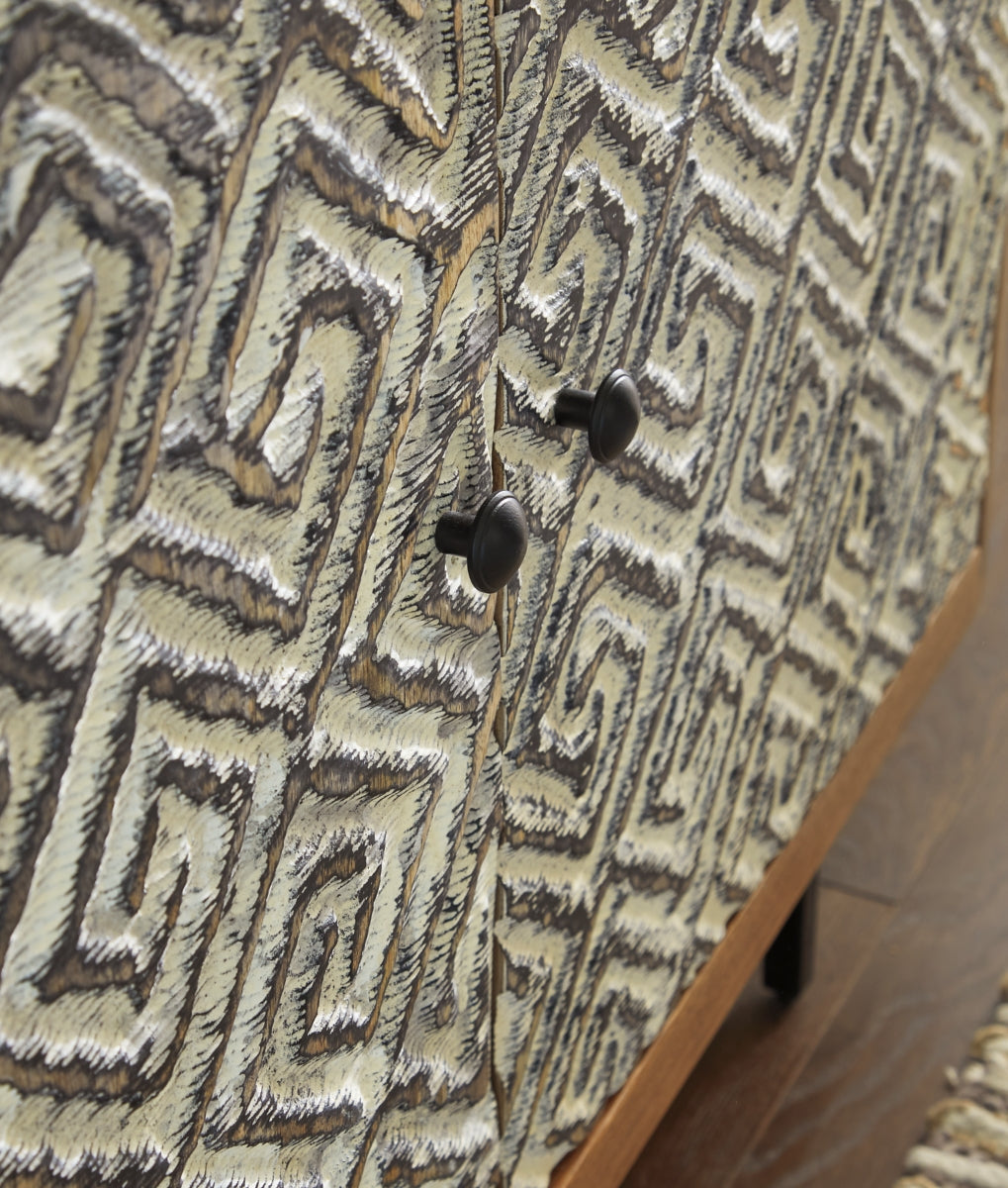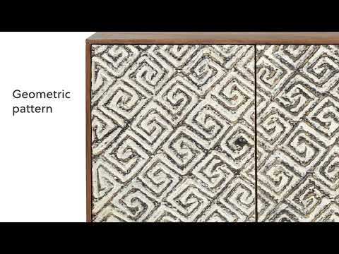 If you’re looking for a cool, clean-lined accent piece loaded with character, then you’ll surely want to carve out some space for this accent cabinet. Fabulous flush-mount doors wow with their carved Greek key design for added dimension and tonal contrast. Three interior shelves accommodate your storage needs. | Product Features