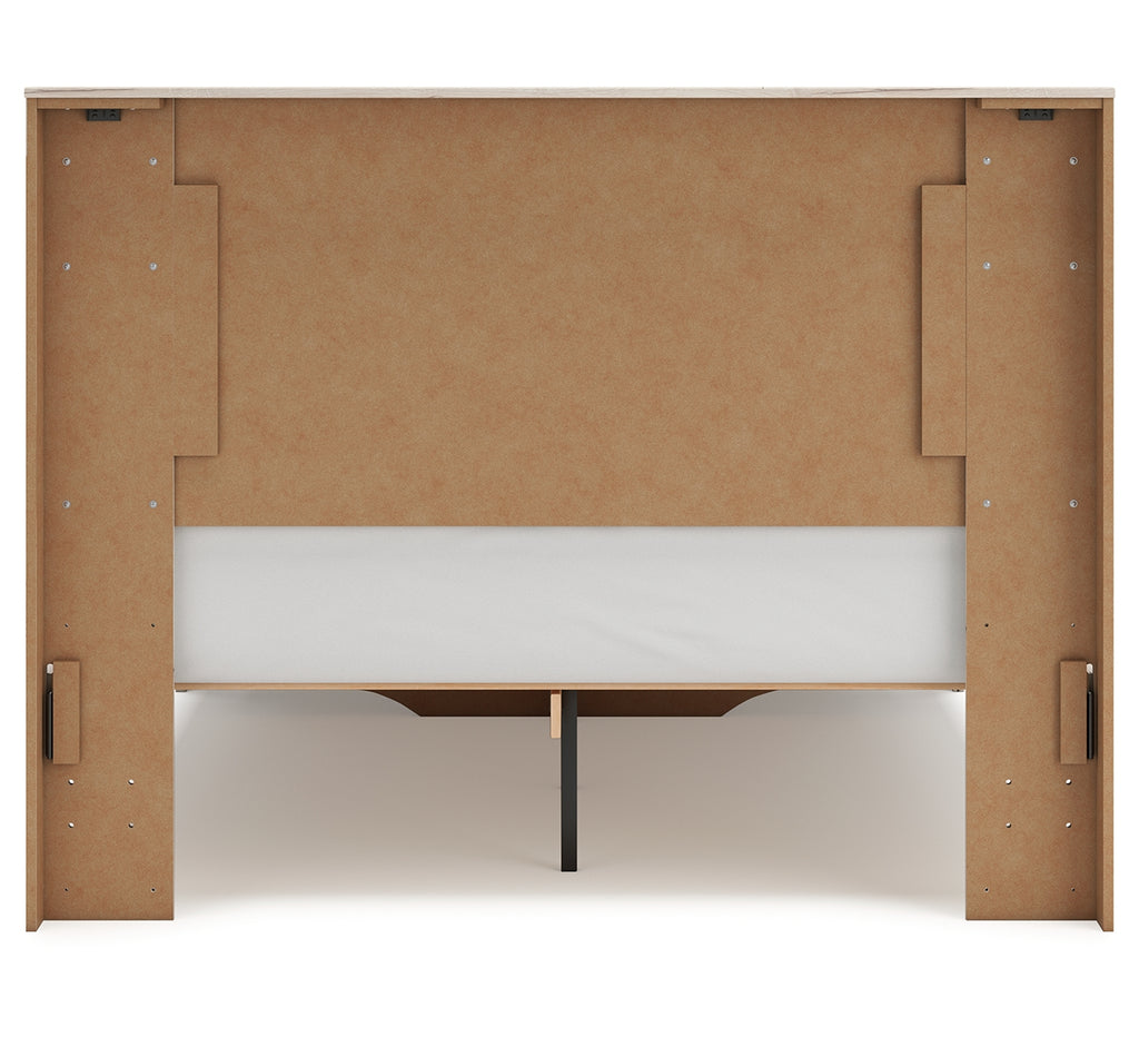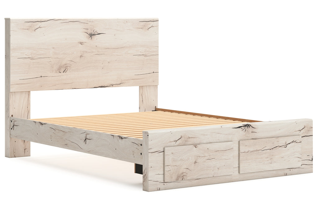 - Includes panel headboard, storage footboard, platform rails and roll slats