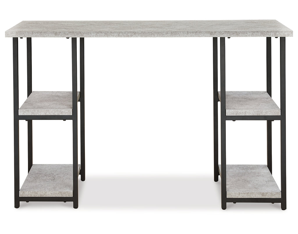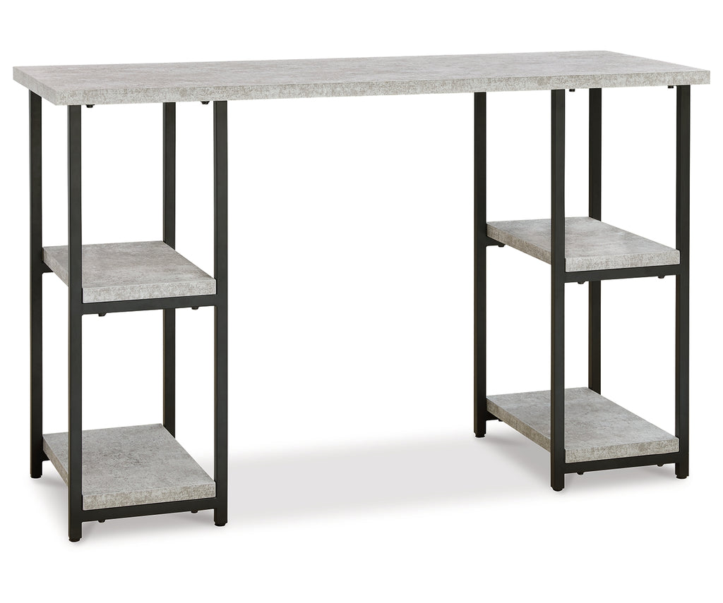 Casual linear style is ideal to keep your home office aesthetic appealing and clean. This desk features an architectural look with its faux concrete melamine top and a metal base in a dark pewter-tone finish, for the perfect balance of crisp and cool. The double-shelf pedestal design offers additional storage space. Melamine is an increasingly popular choice for table surfaces. It can be manufactured to resemble wood grain but with kid-friendly durability. | Product Features