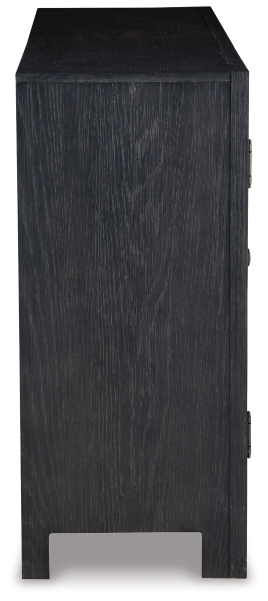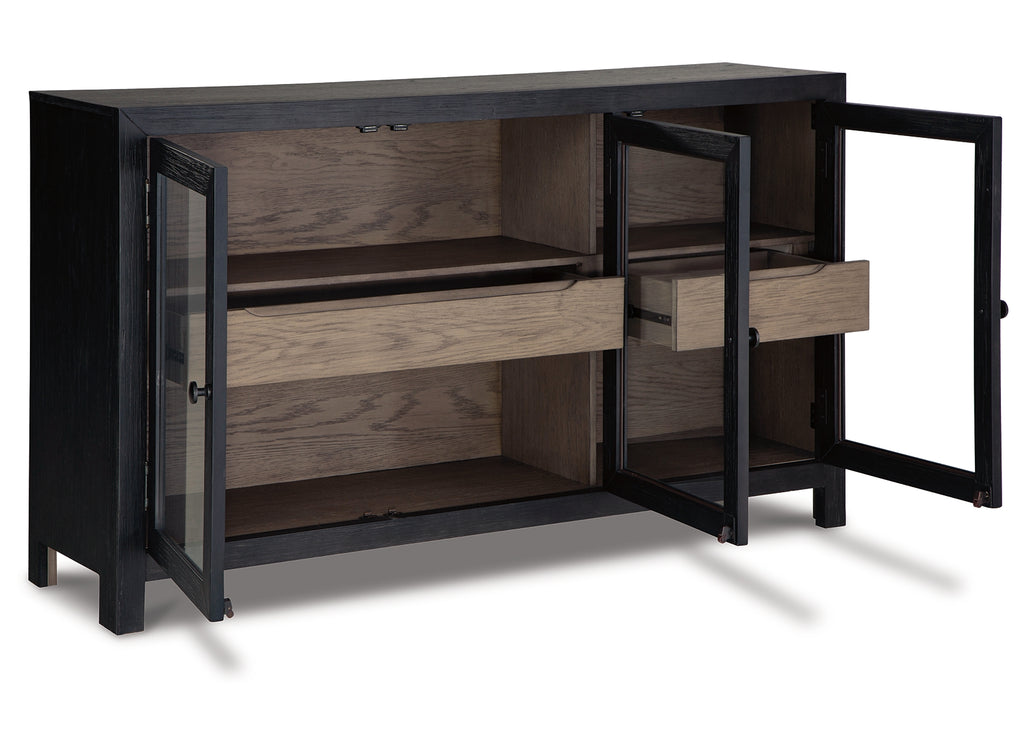 Add layers of form and function to your space with this accent cabinet. It's draped in a black finish on the outside and a warm gray finish inside, for a classic look that seamlessly transitions from casual to modern styles. This accent cabinet's flexible design includes three doors and two shelves for simple and streamlined storage. | Product Features