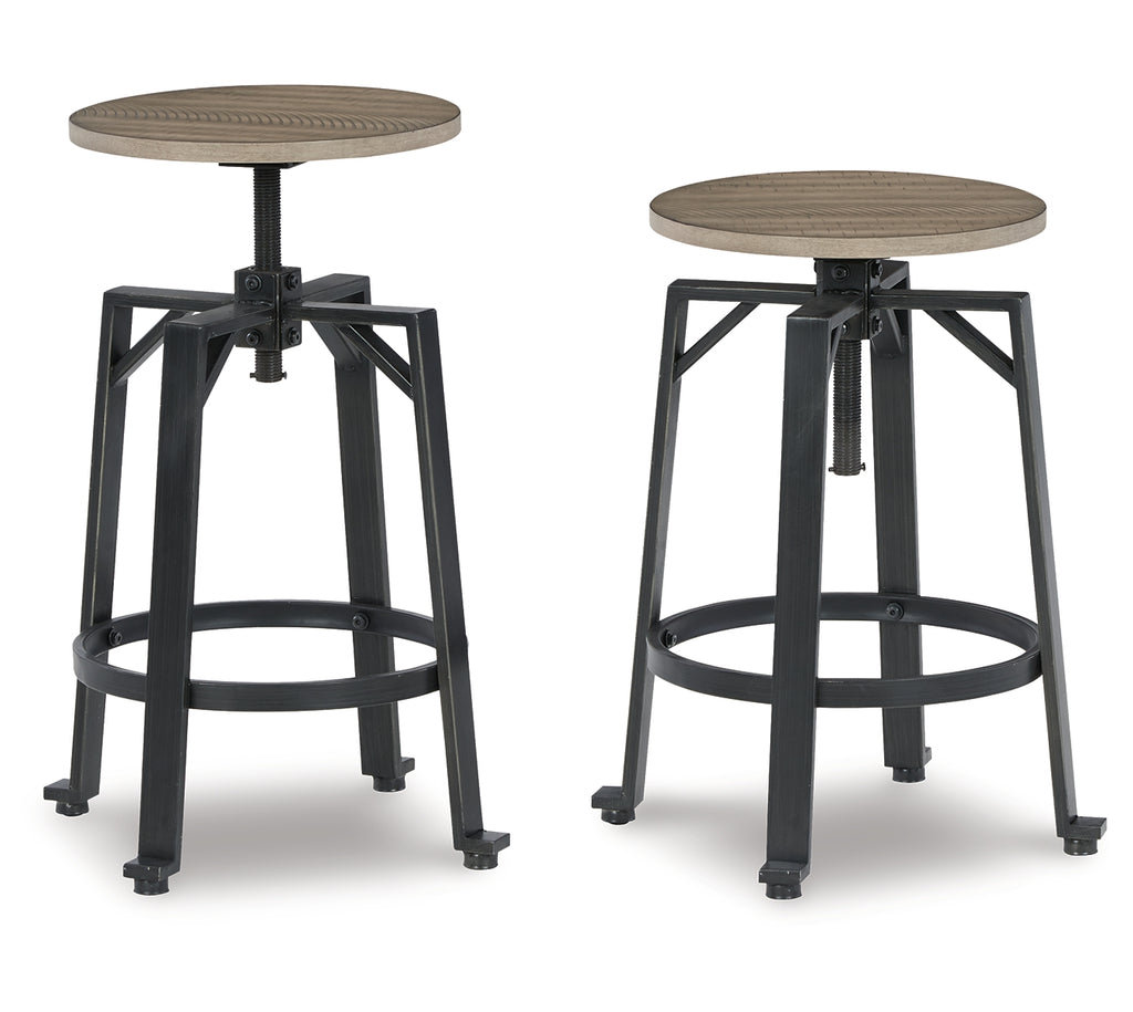 Delight in the effortless two-tone look of this swivel stool. Dark iron-tone metal and distressed brown wood pair for a rustic look with modern sensibility. The stool's adjustable height, swivel motion and footrest allow you to find your ideal comfort position. | Product Features