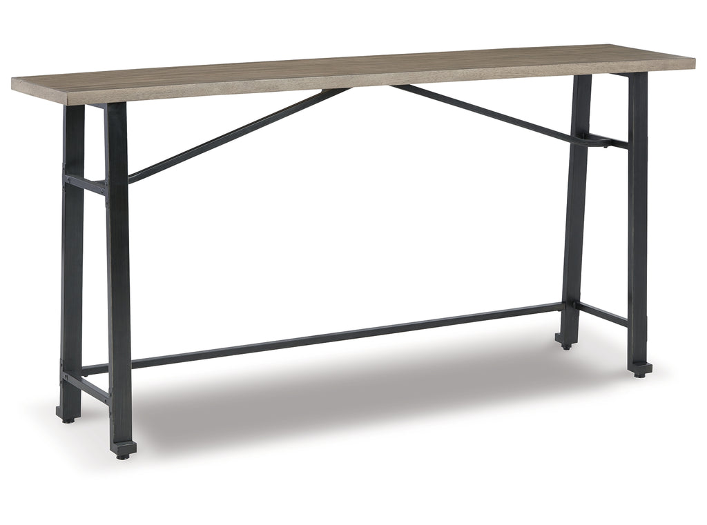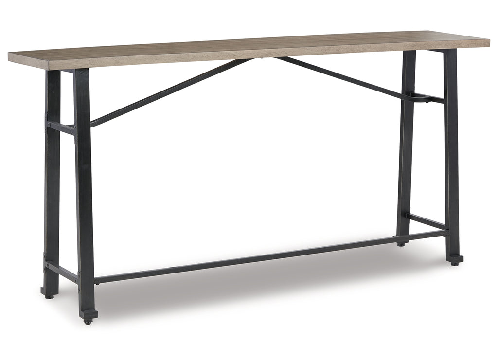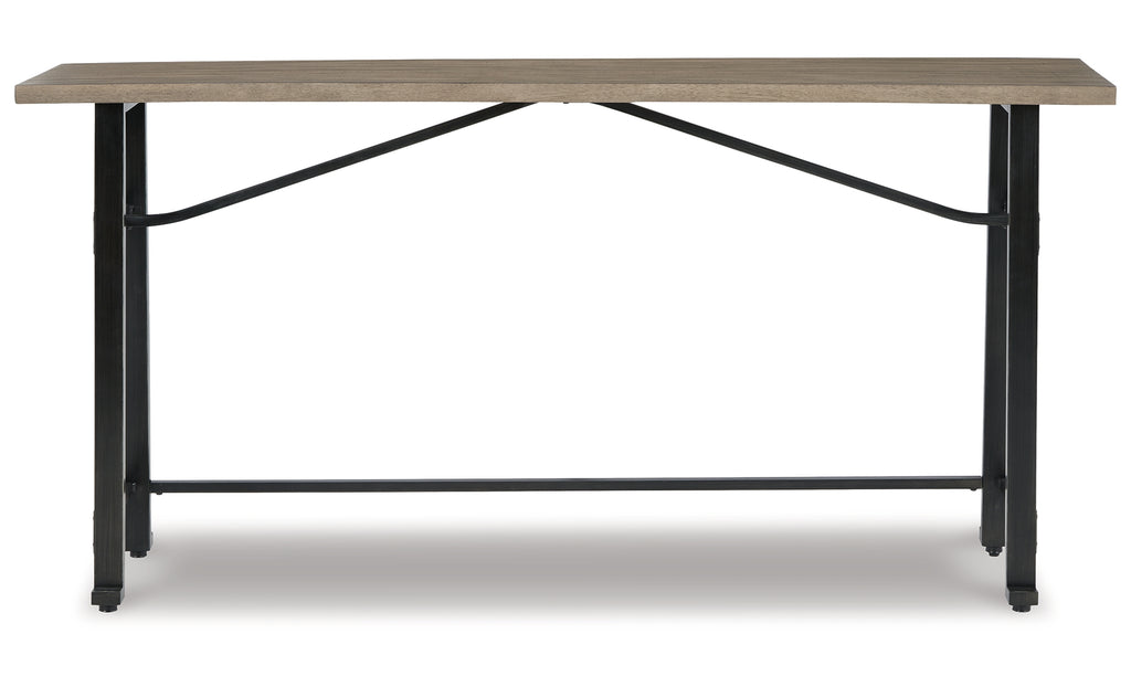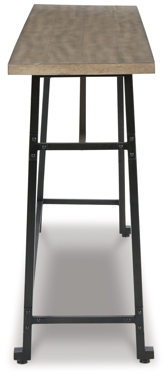 Delight in the effortless two-tone look of this long counter table. Dark iron-tone metal and distressed brown wood pair for a rustic look with modern sensibility. This charming piece is great for small spaces, easily tucking against a wall or the back of a sofa. | Product Features