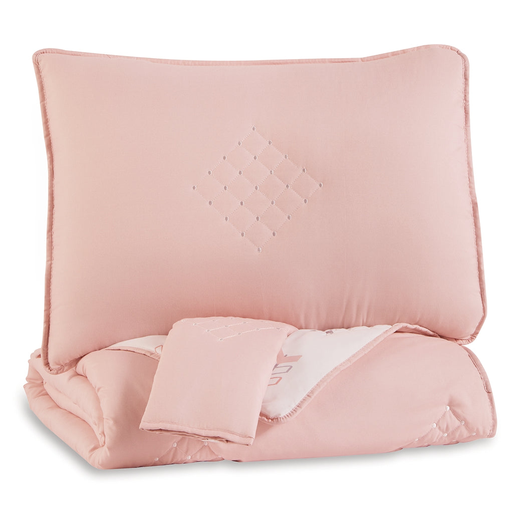 Bring a sophisticated look to your bedroom with this comforter set. Featuring a solid pink background with a stitched diamond design, the comforter reverses to a crisp and fresh arrow design in pink, white and gray—giving you the choice to change up your bedroom decor quickly and easily. | Product Features