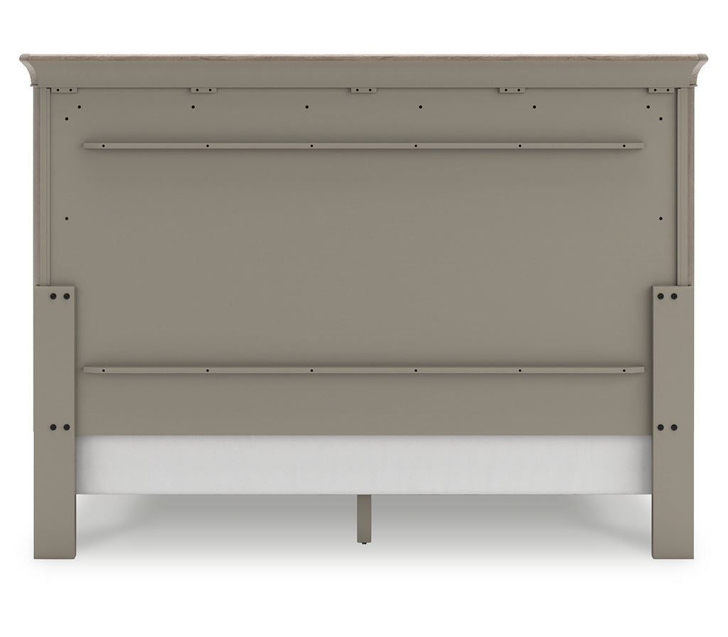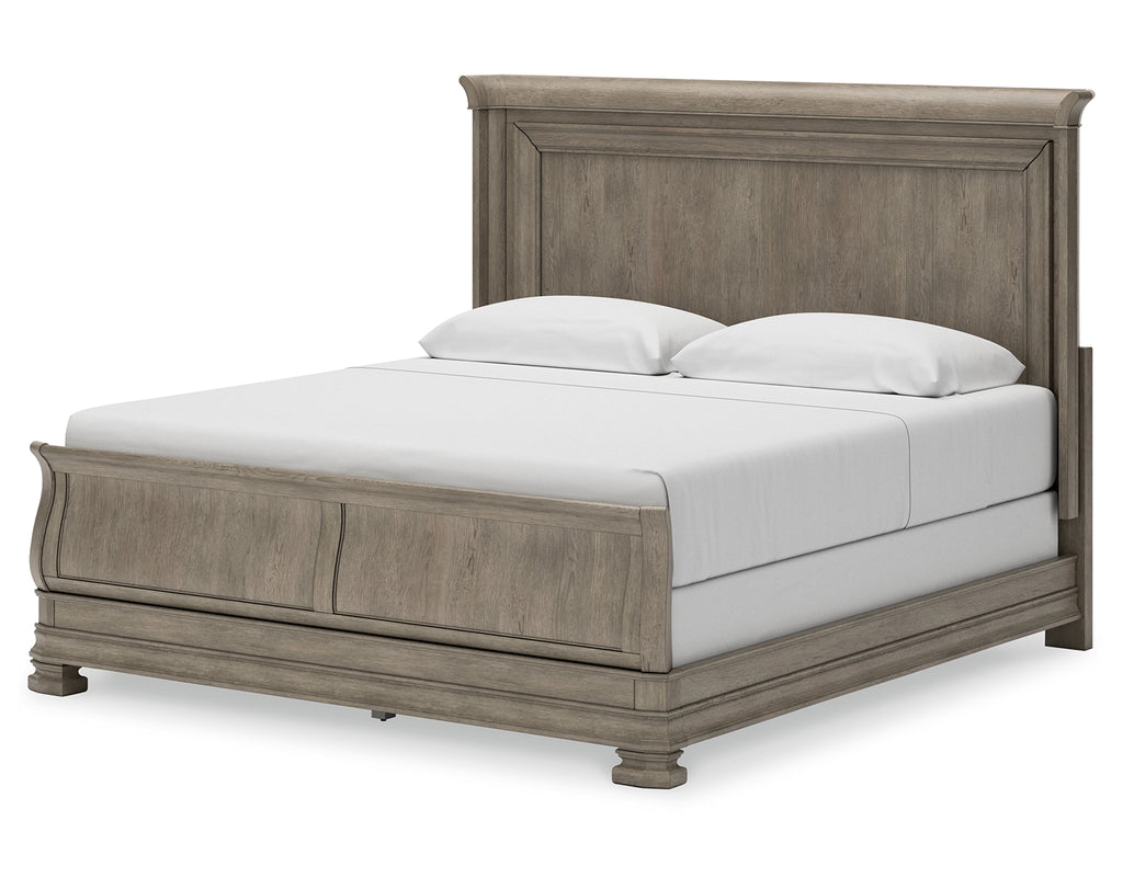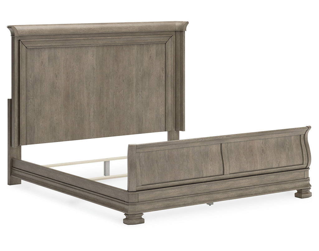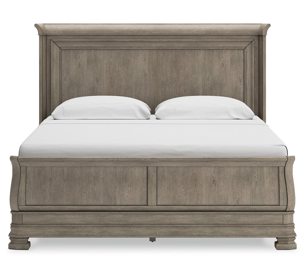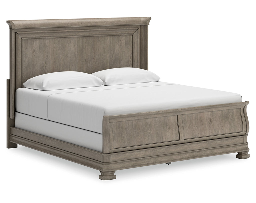Traditional design motifs, redefined for today’s trends. Inspired by timeless Louis Philippe styling, this king sleigh bed is distinguished by its stunning attention to detail. You’ll find the light gray finish encourages an attitude of laid-back luxury. Complete with a shelter wing headboard design and a thick profiled base, it reigns over your bedroom with an air of casual elegance. | Product Features