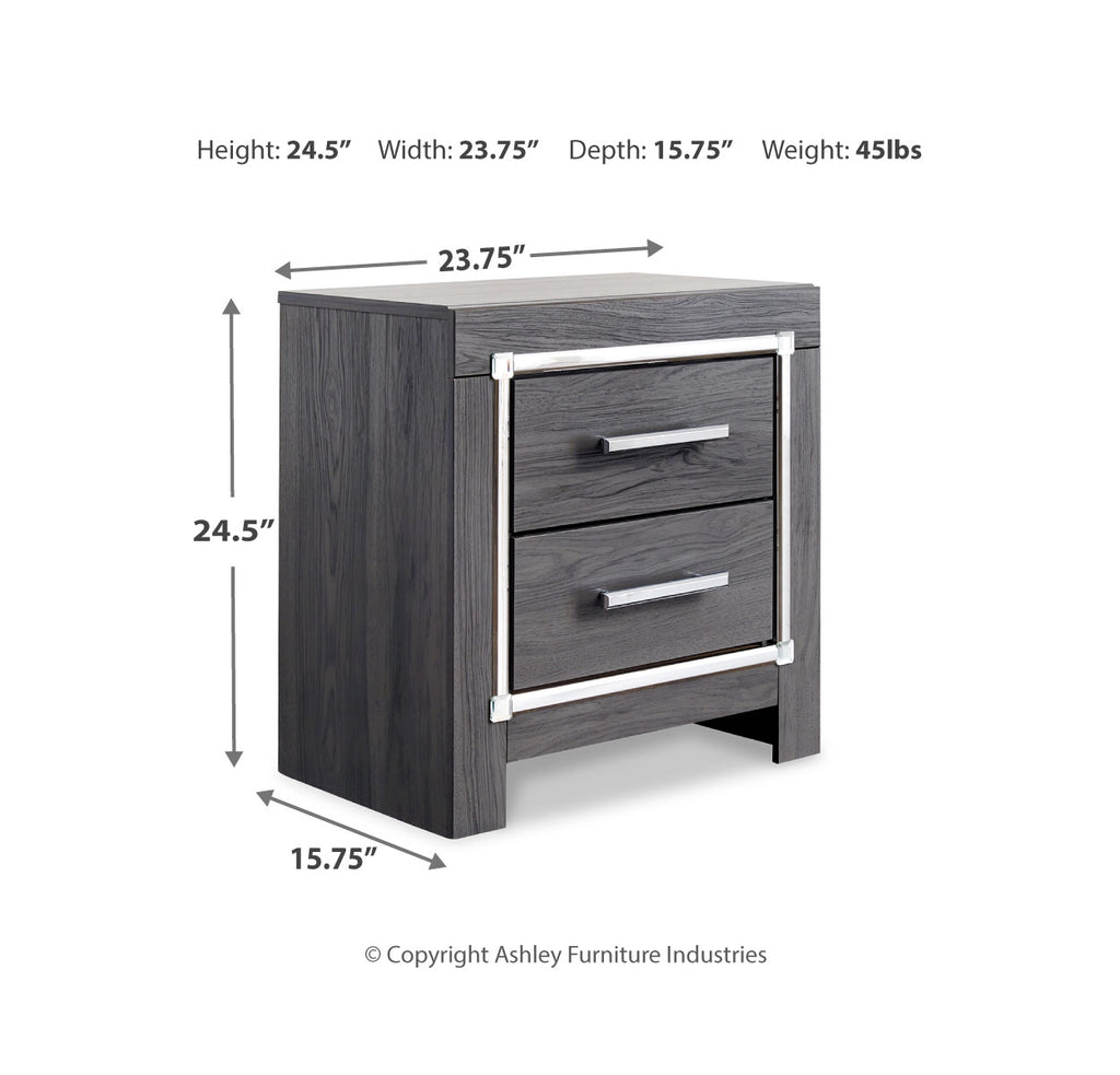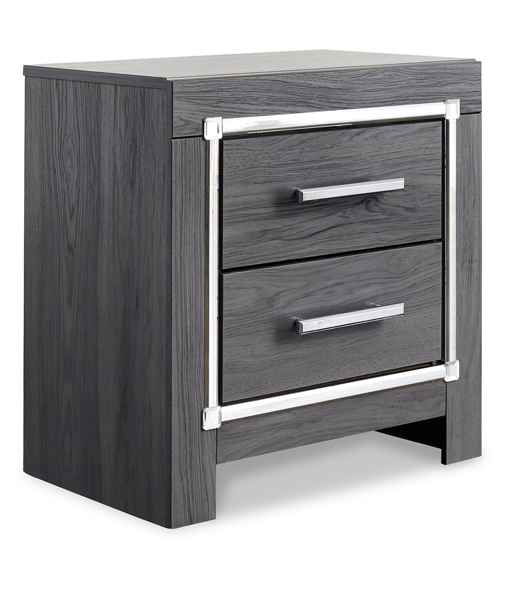 Reminiscent of Hollywood glamour of yesteryear, this nightstand interprets luxury in a decidedly modern way. A dazzling gray finish with faceted chrome-tone accents enhance the star power, while two smooth-gliding drawers provide convenient bedside storage. Offering the best of both worlds, this nightstand includes USB or wireless device charging. | Product Features