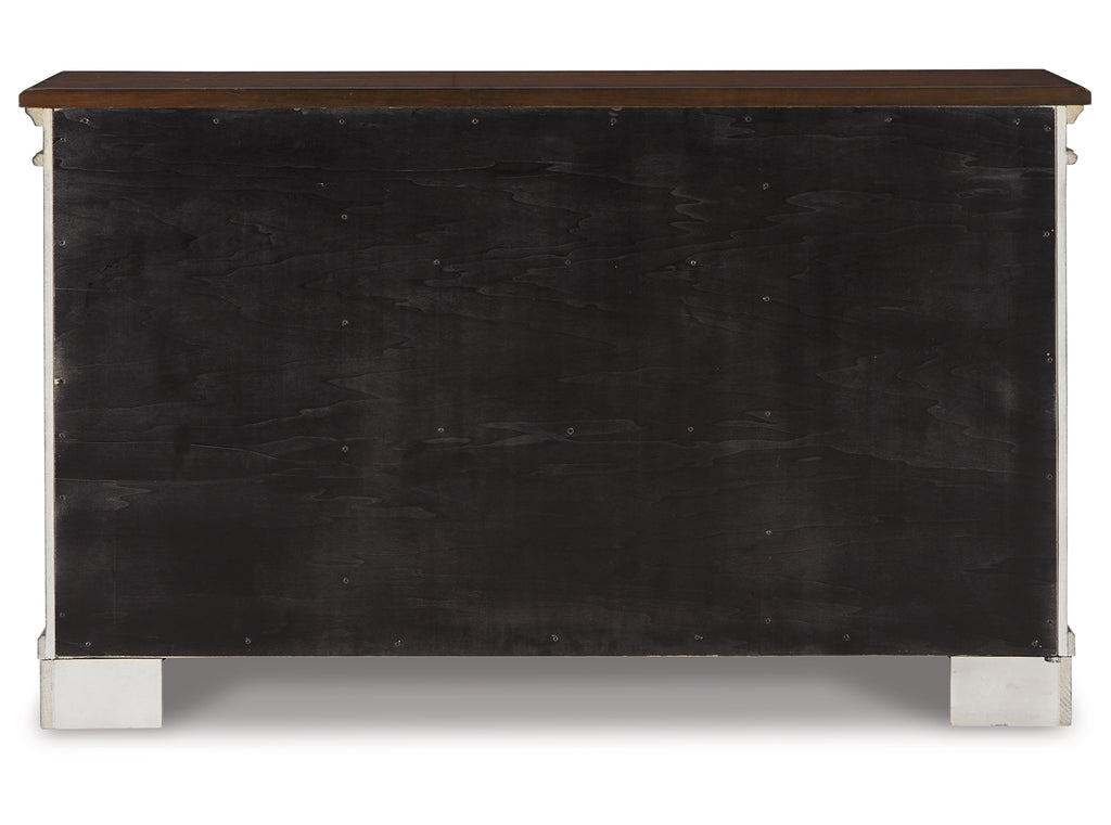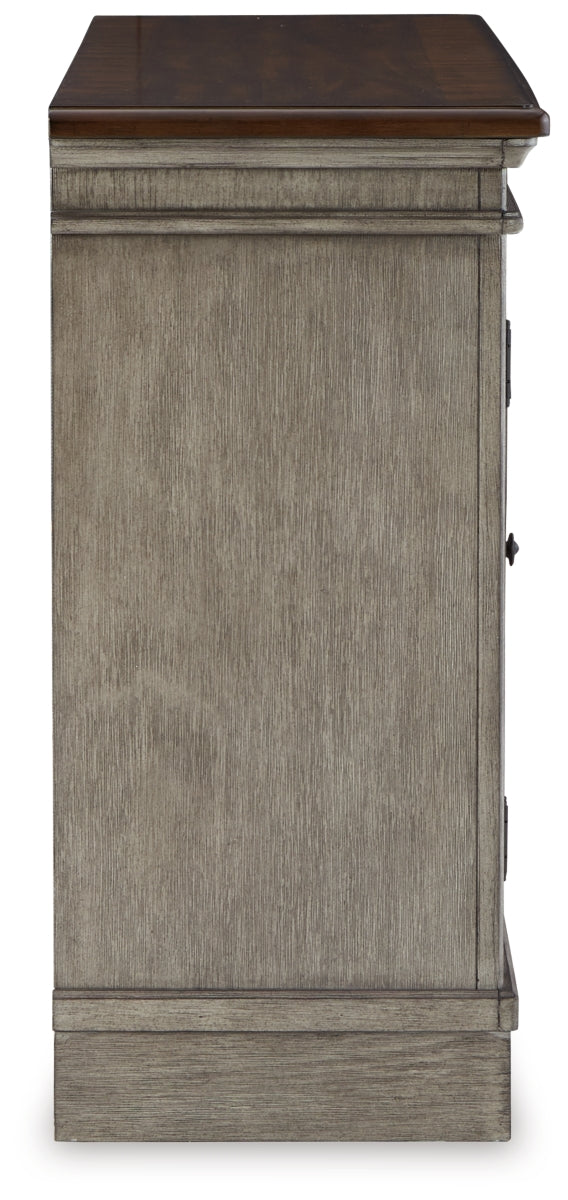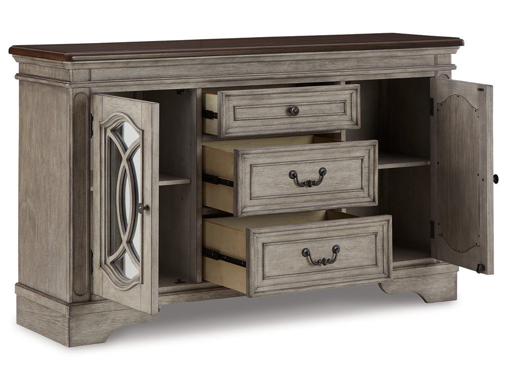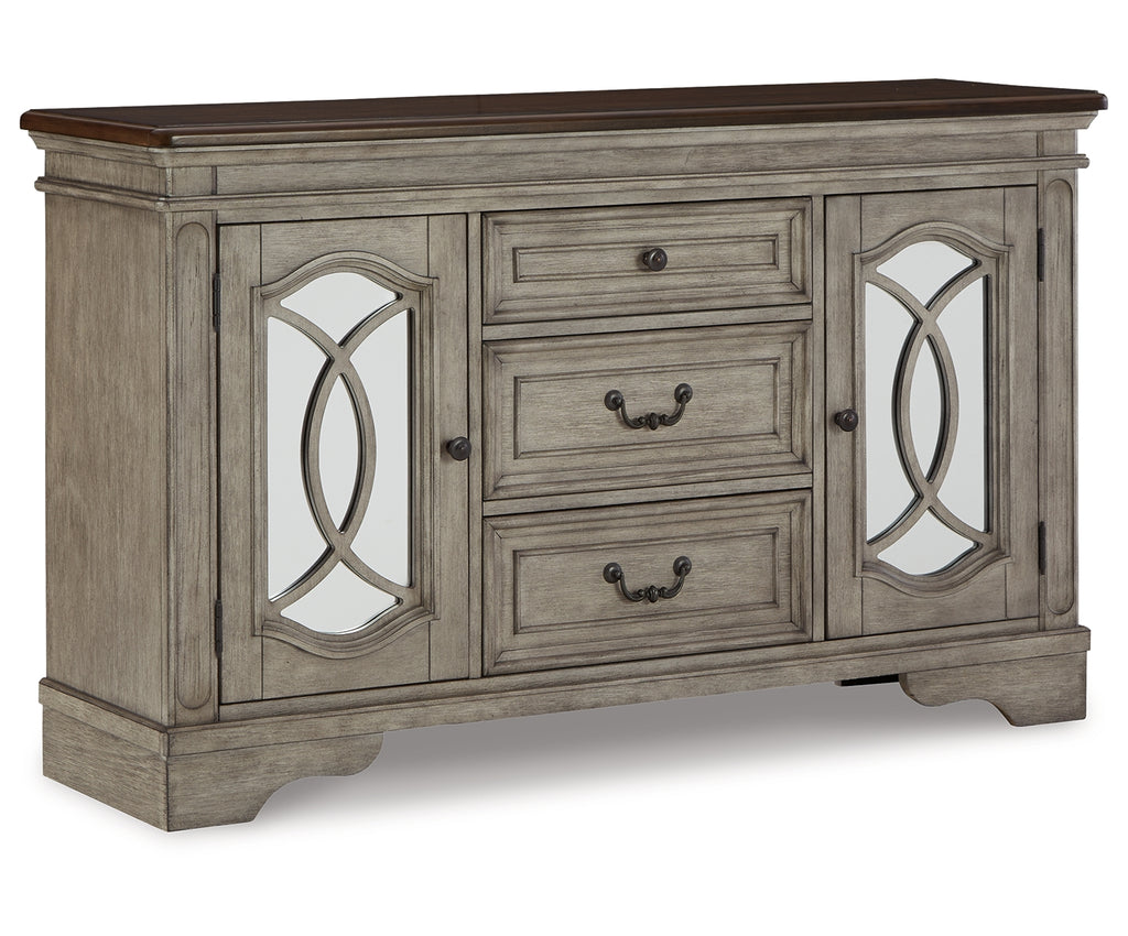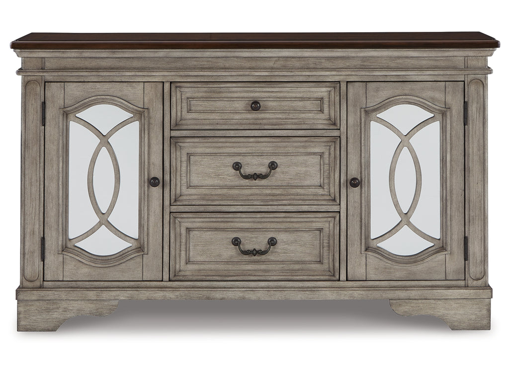 Serve up a sense of traditional cottage design with this dining room server. It features a pair of cabinet doors with inset mirrored glass and decorative fretwork. The server's three smooth-gliding drawers with dovetail construction and black felt bottoms are perfect for storing more delicate items. An antiqued gray body and rich deep walnut brown top, along with bail pulls and knobs finished in a dark bronze tone, complete the beautiful design. | Product Features