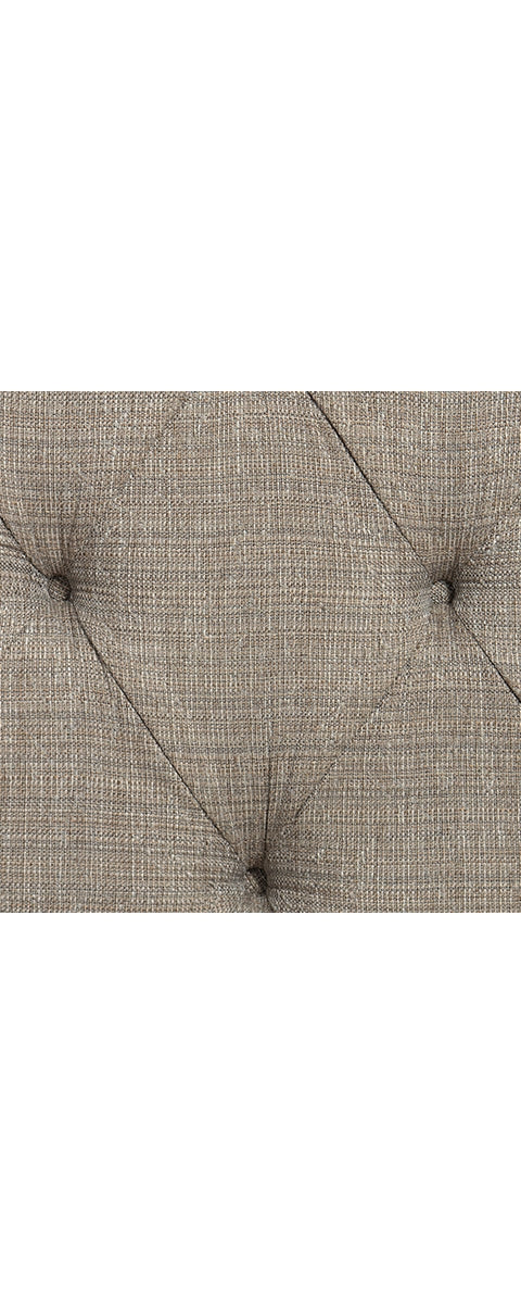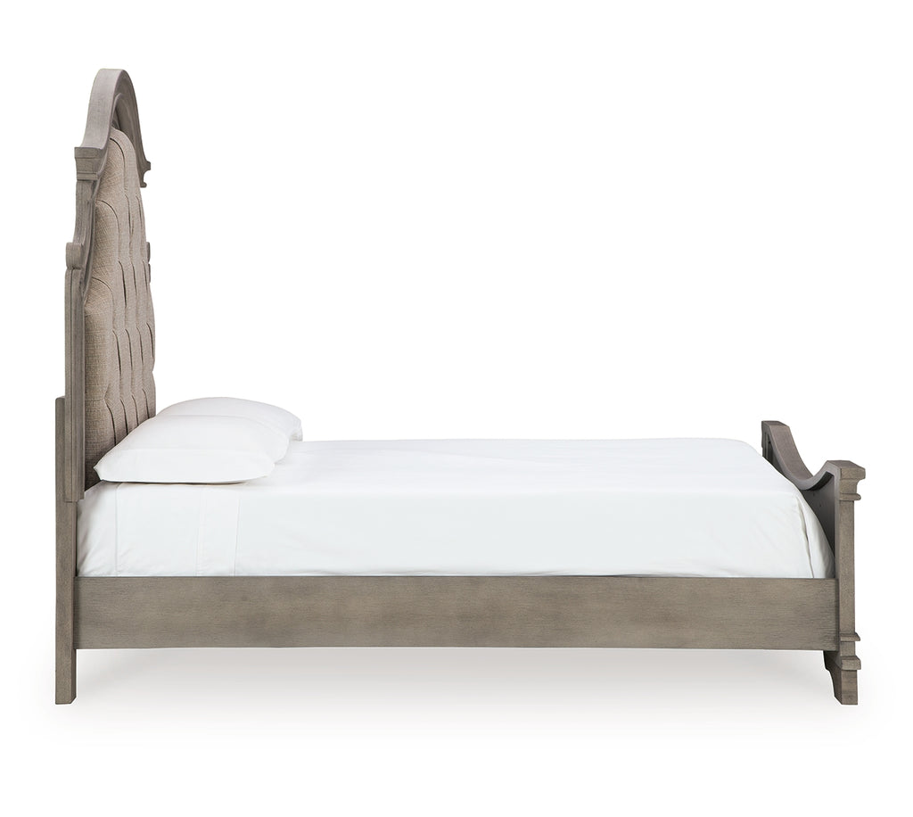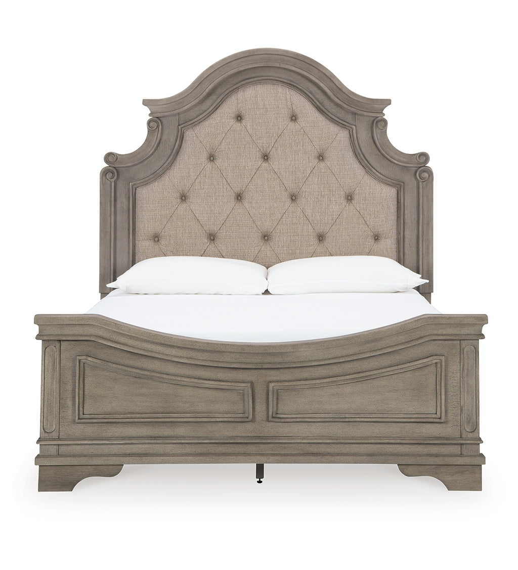 Cottage quaint styling and quality construction make this queen panel bed a dream come true. An antiqued gray finish and beige upholstery provide rustic warmth. The ornately shaped headboard marries classic design with homey charm for an elegant bedroom must-have. | Product Features