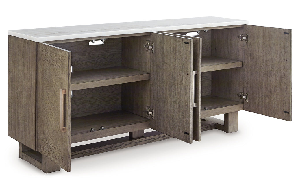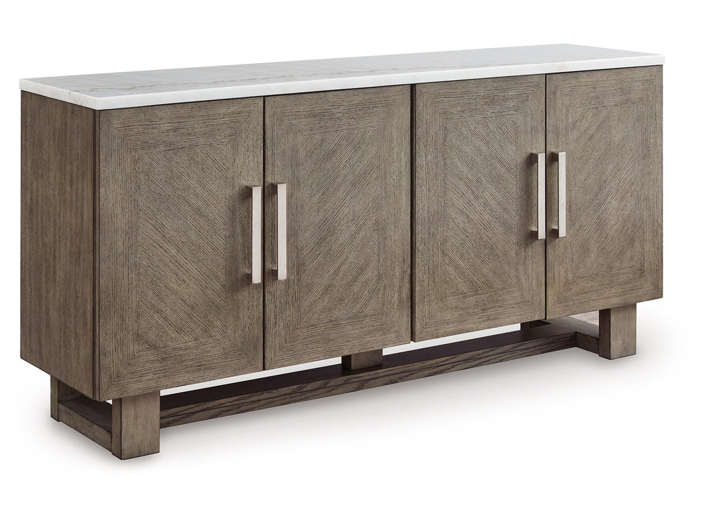 Welcome casual, contemporary style and functionality to your home. This TV stand delivers a mixed-material vibe with its white marble top and grayish brown finish, lending a laid-back look that’s so welcome at the end of a long day. Cabinet doors with framed chevron accents and large silvertone pulls add dimension and style. And there’s plenty of room to store entertainment accessories, with adjustable shelving and cord management holes for added convenience and versatility. | Product Features