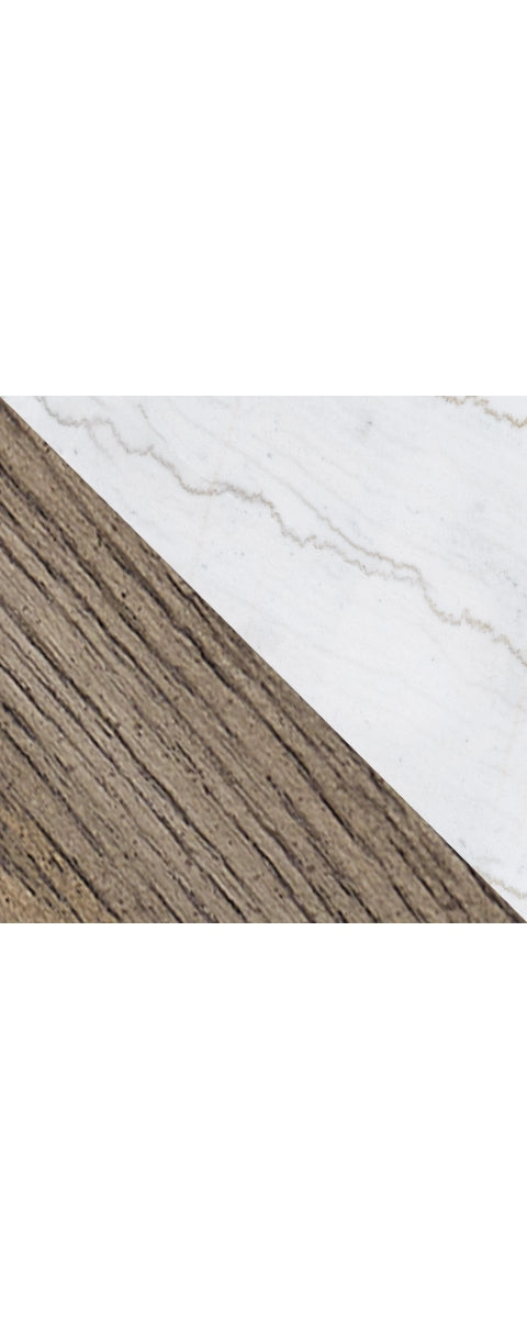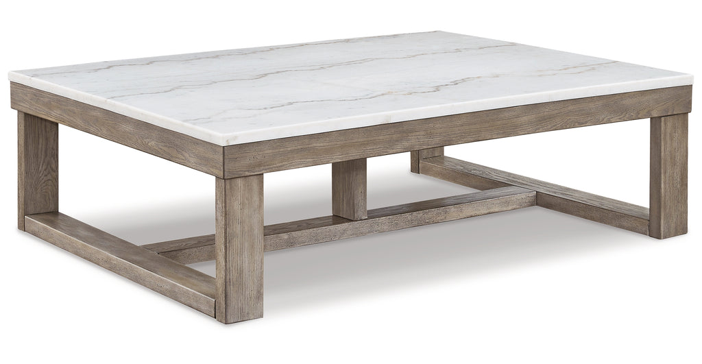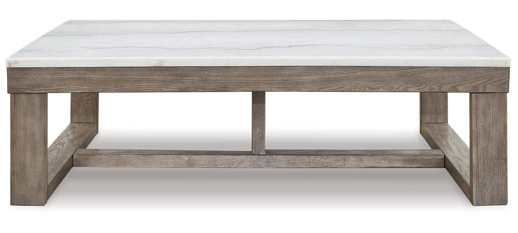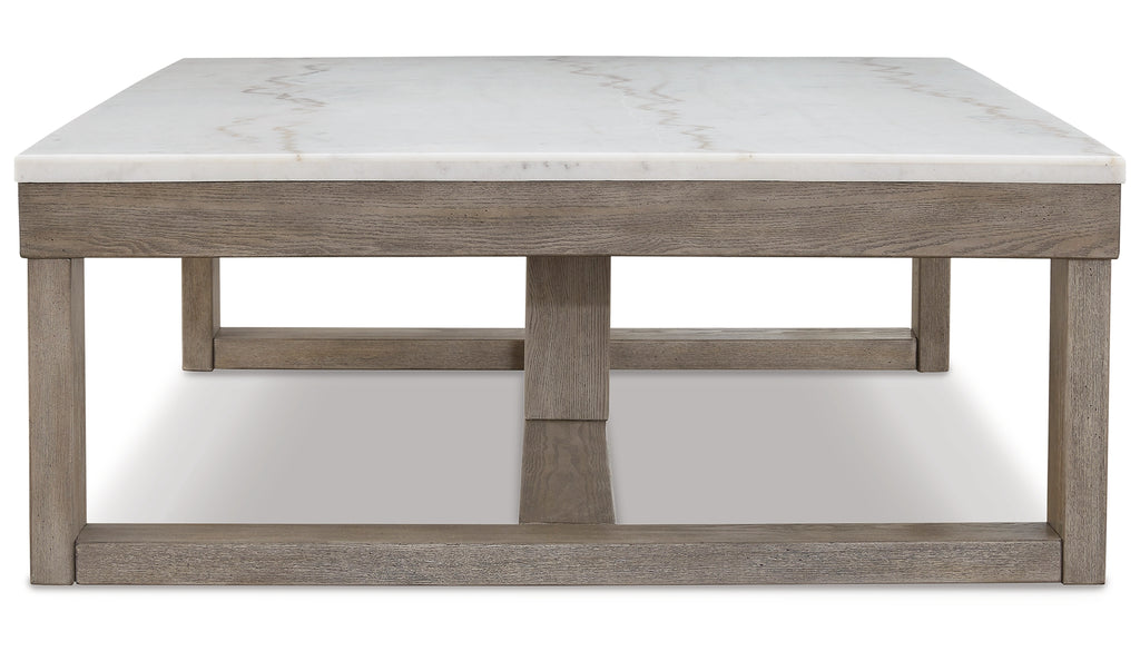 This coffee table is simple in design but big on style. Finished with a trend-right grayish brown wood tone, its bold, blocky profile and natural marble top are timeless classic choices that work so well with large sectional family room settings. Adding to its beauty, the marble top's color variations, fissures, mineral deposits and veining are naturally formed and are not defects. | Product Features