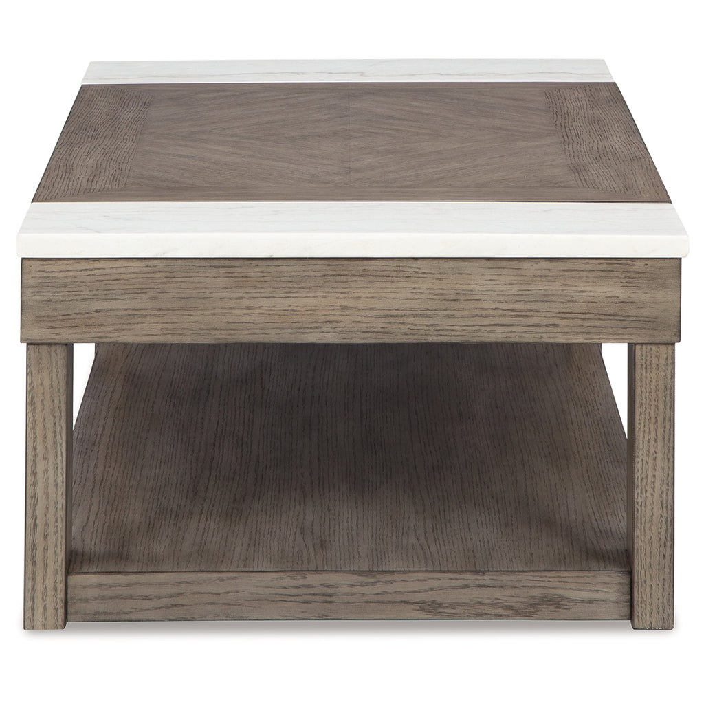 Welcome casual, contemporary style and functionality to your home. This lift-top coffee table is equipped with a convenient lift-top surface for working or dining from your sofa, as well as a spacious lower shelf to display treasured items. Natural white marble accents deliver a mixed-material vibe, while the grayish brown finish lends a laid-back look that’s so welcome at the end of a long day. Casters allow you to move the table whenever and wherever it’s needed. | Product Features