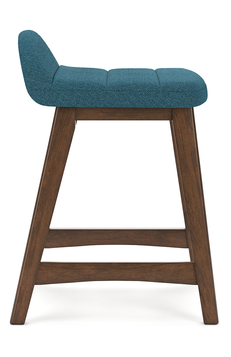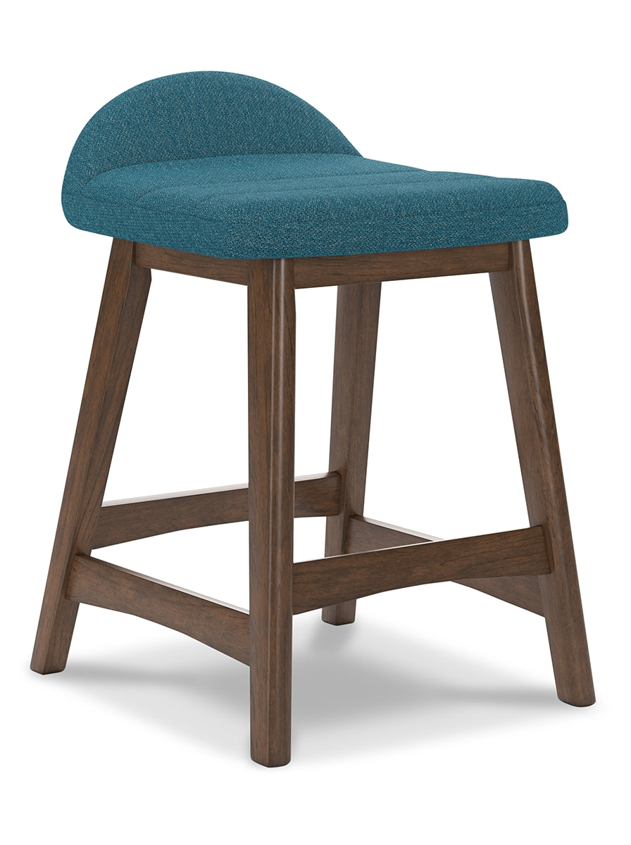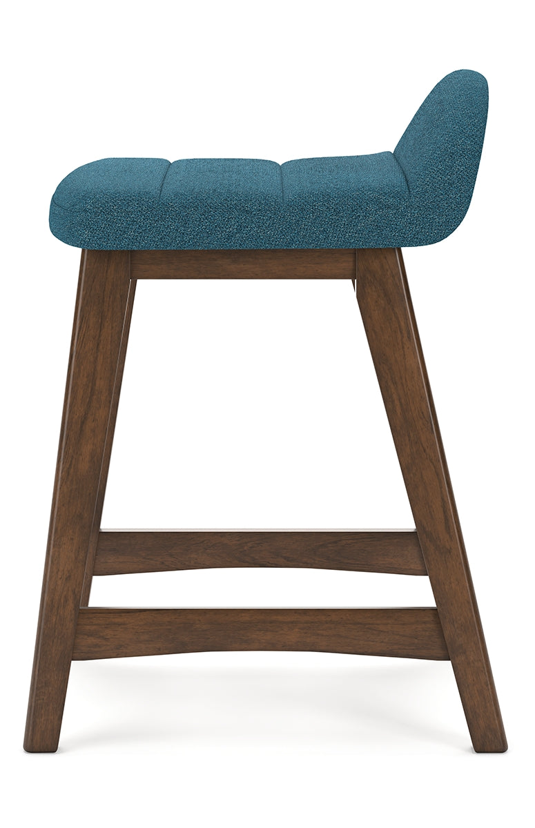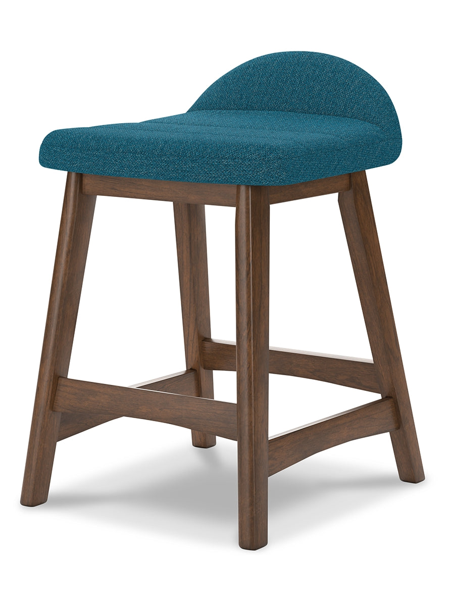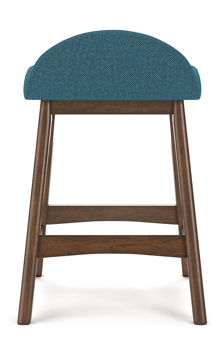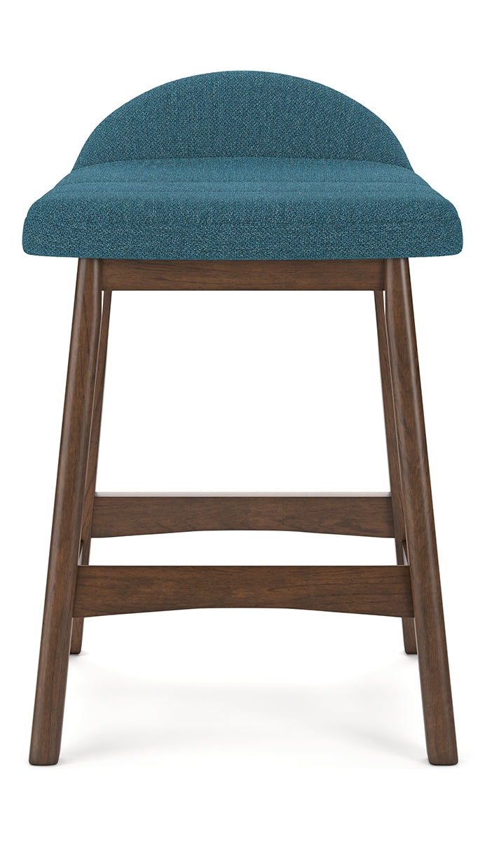 A refreshed take on retro aesthetics. This upholstered bar stool adds an air of playful simplicity to your dining space, capturing the architectural language of mid-century stylings. The seat invites the eye with a soft-edged silhouette and chic blue cushion. A casual, yet timeless, finish on the frame creates visual contrast to complete this study in form and function. | Product Features
