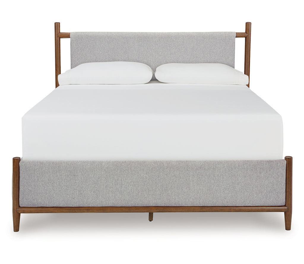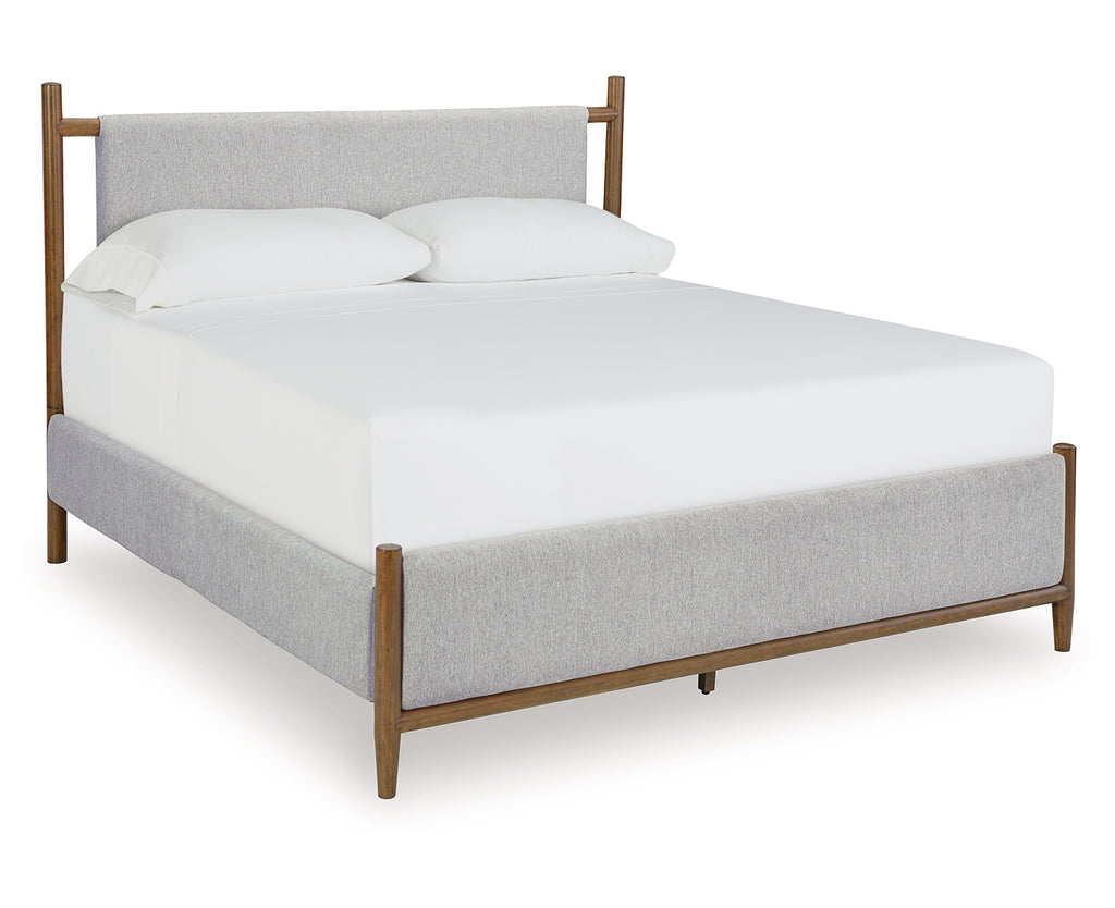 Embrace the allure of contemporary or mid-century interiors with this king upholstered panel bed. Its versatile, timeless design, featuring a sling-style cushioned headboard, gently cradles your senses. Ready to refresh and redefine your space, this bed is the ideal choice to elevate your bedroom retreat. | Product Features