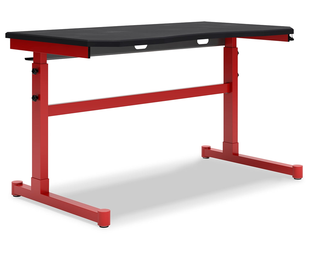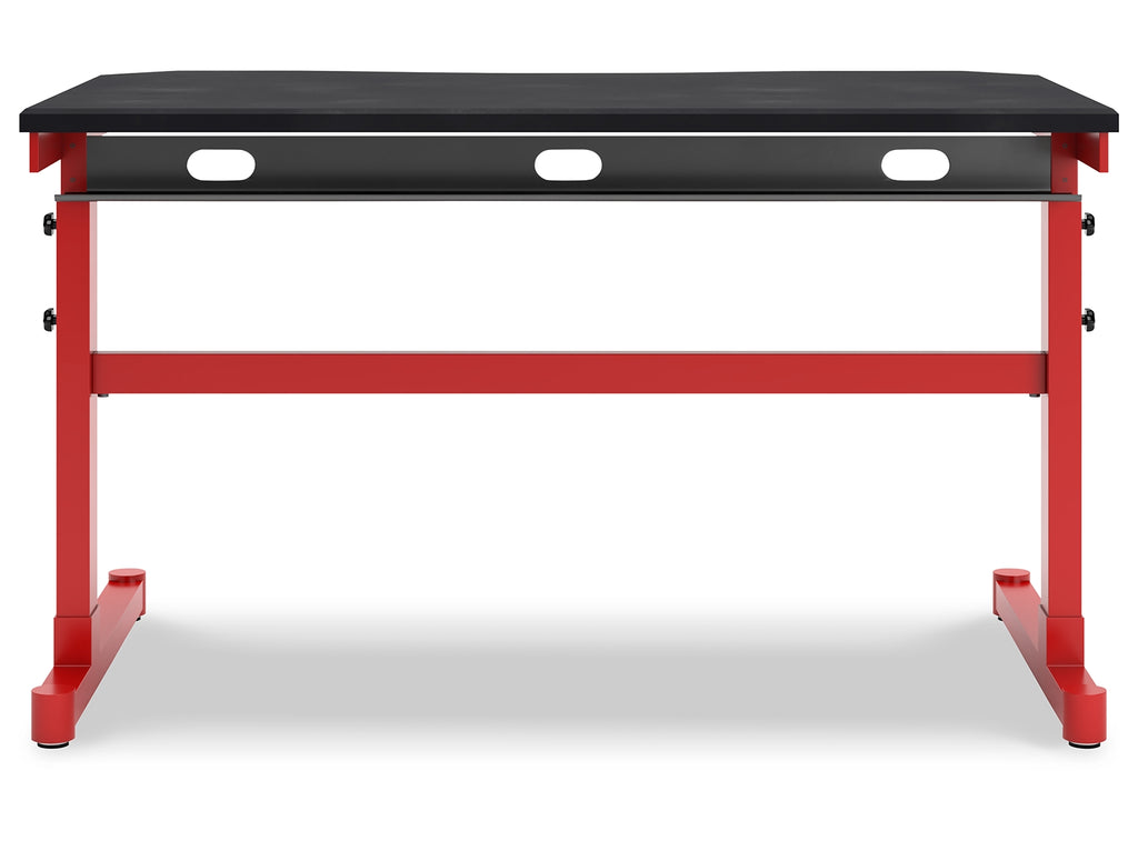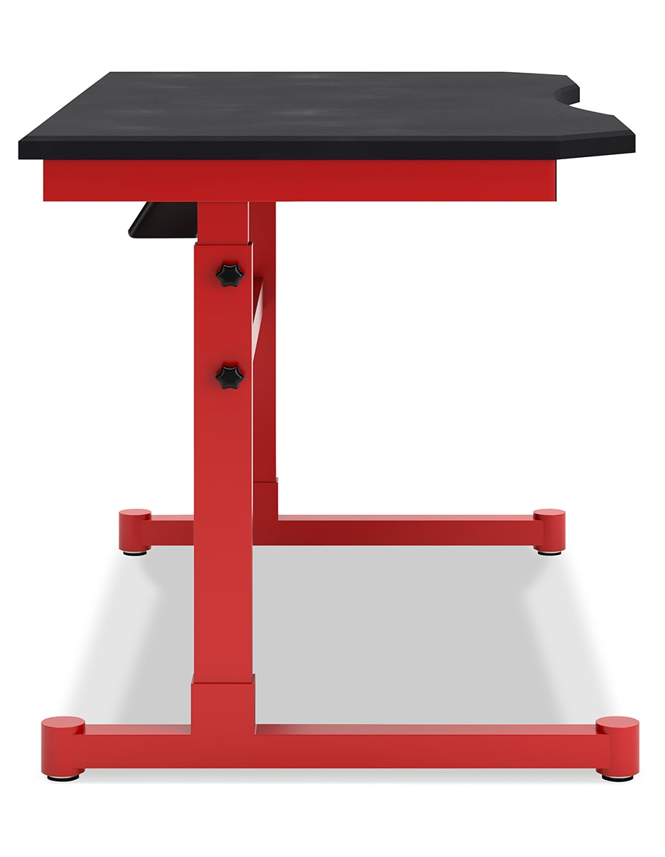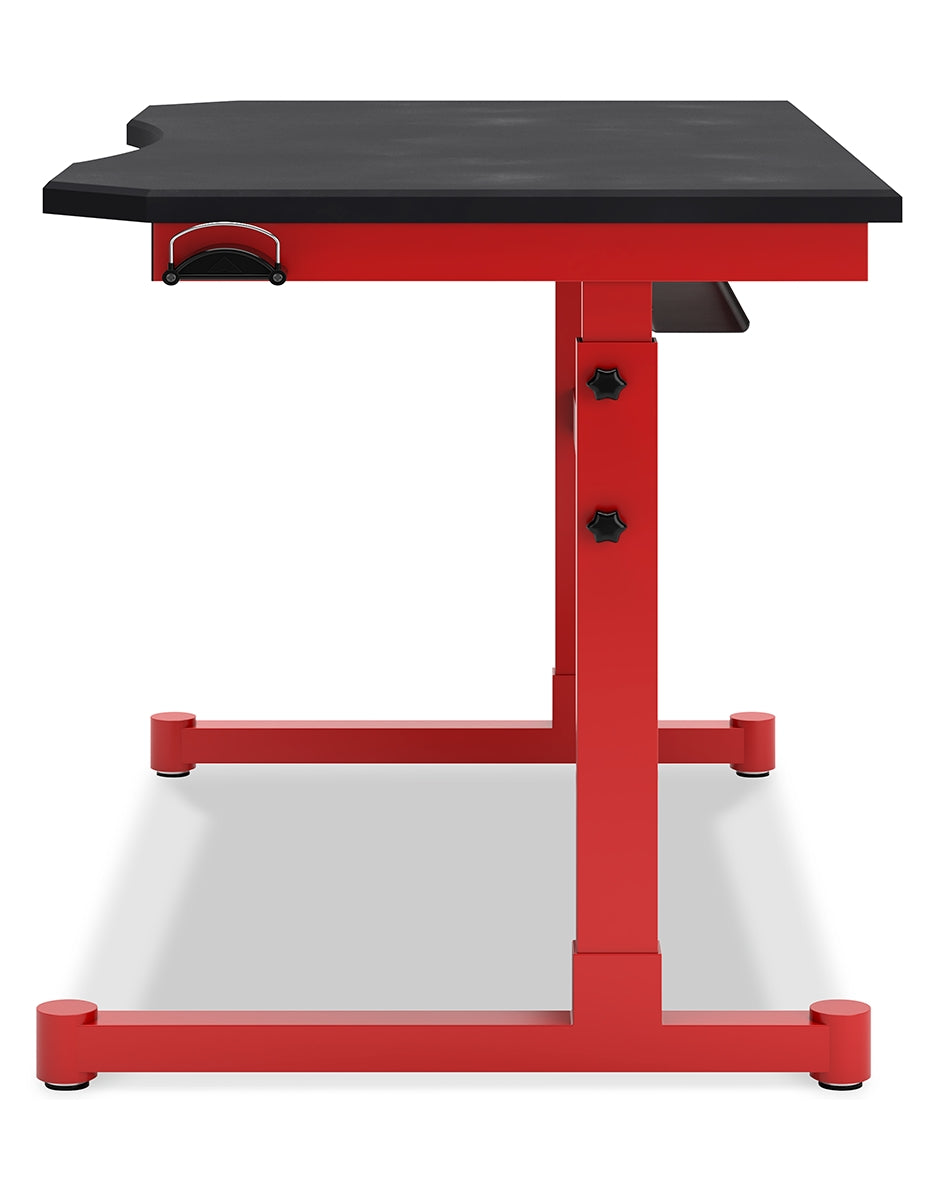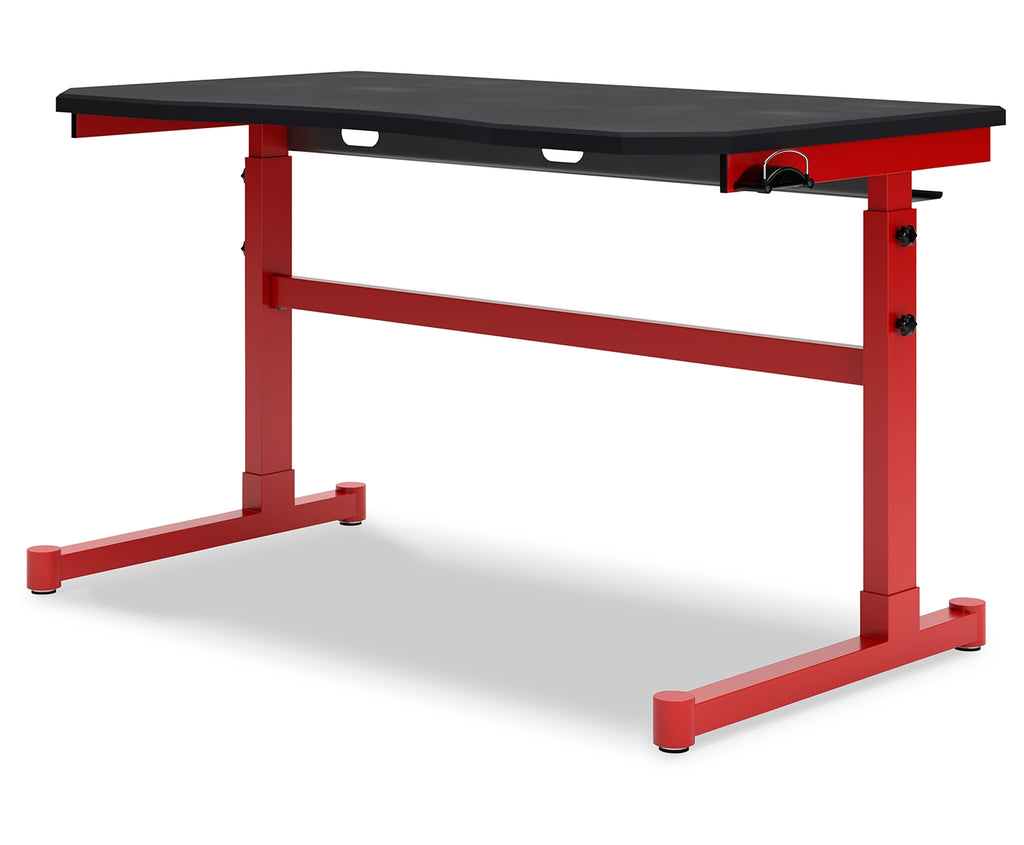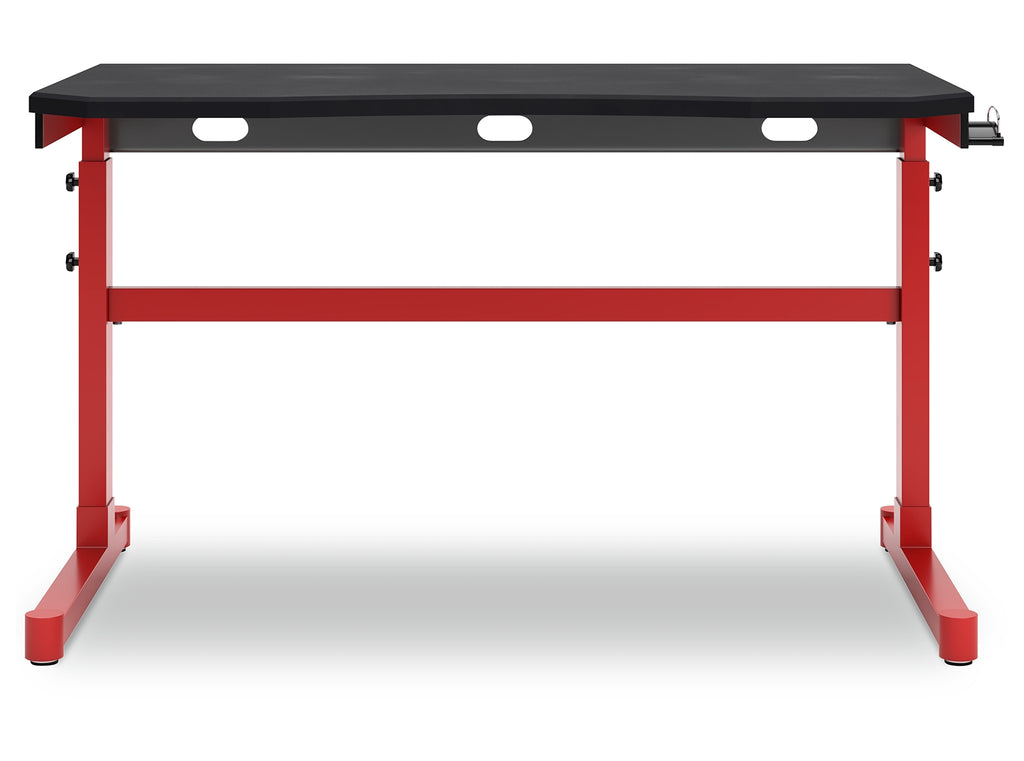 Work smarter (and look cool doing it) with the new-age efficiency of this adjustable height home office desk. Its streamlined design is ideal for gaming or as a general workstation. This super-sleek yet fully-loaded home office desk has a mouse pad surface cover and three height options for ultimate efficiency. The fantastic features also include a headset hanger conveniently mounted on the side, as well as a raceway tucked underneath for managing all your cords. | Product Features
