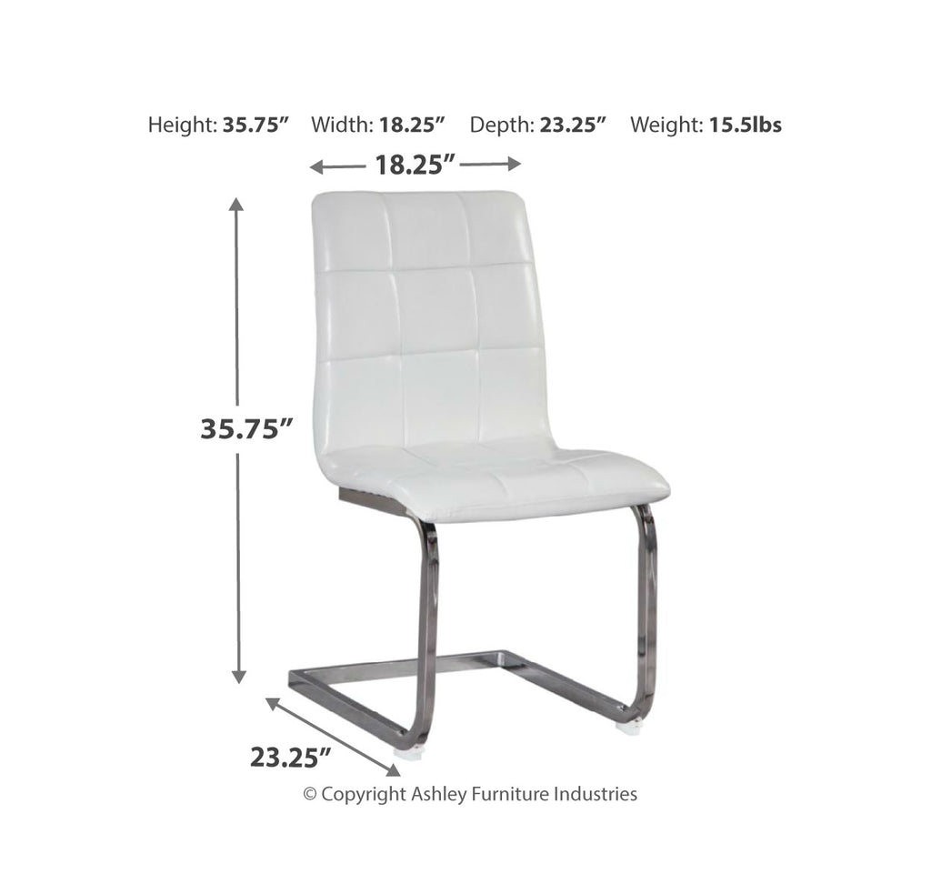 Wowing with a slim but sturdy profile and sculptural C-frame design, this dining room upholstered chair is sure to whet your appetite for ultra-contemporary style. Comfortably contoured seat is covered in a fabulous white faux leather with subtle grid tufting. Metal frame’s chrome-tone finish contrasts with a high-sheen effect. | Product Features