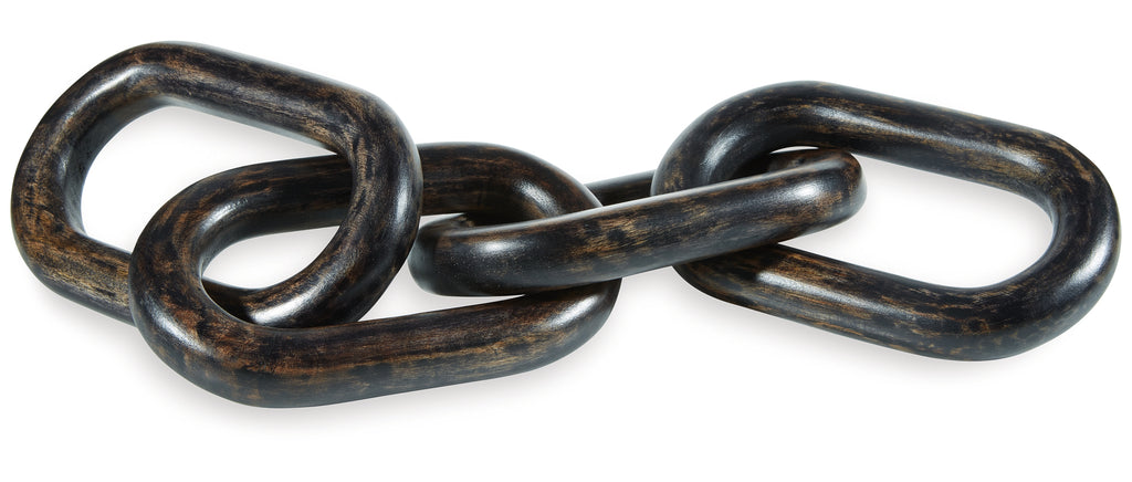 This sculpture sets the standard for casually cool art. Interlocking wood rings in a distressed black finish add an urban industrial element to your decor. When displayed on a TV stand or fireplace mantel, or draped across a stack of books, it's such an impressive focal point.