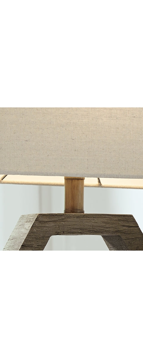 - Made of gray wash finished faux wood with rectangular hardback shade