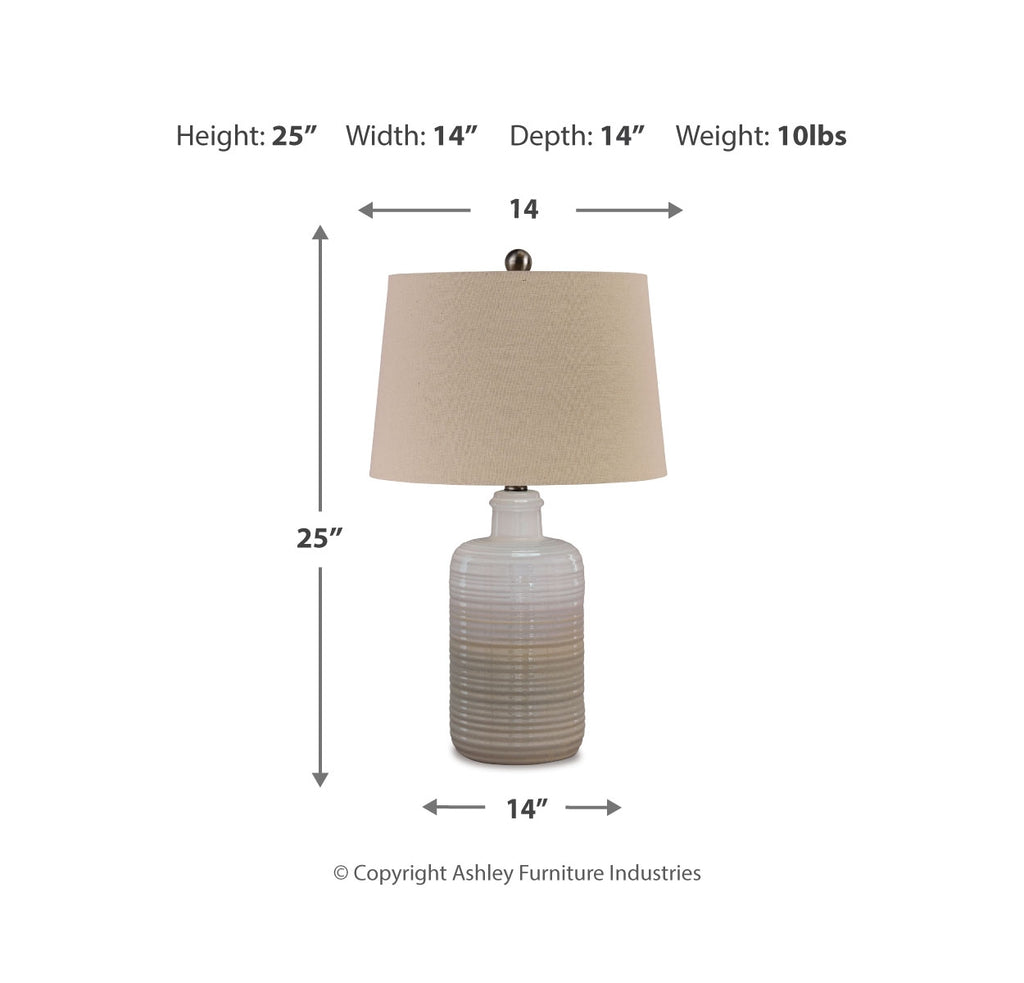 Wowing with shades of taupe and white, this table lamp lights up our world. The glazed, textural base encompasses casual-cool beauty beside any sofa or bed—what a well-rounded pair. | Product Features