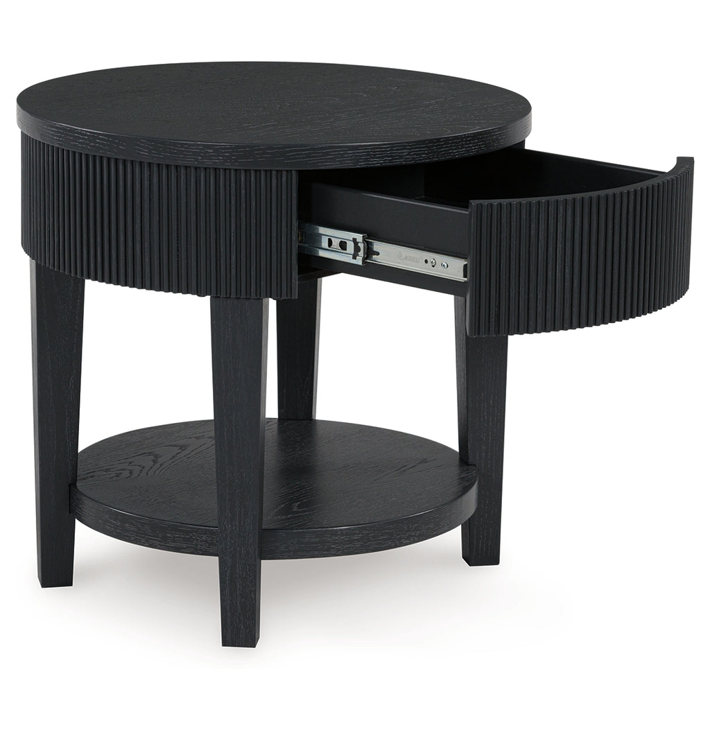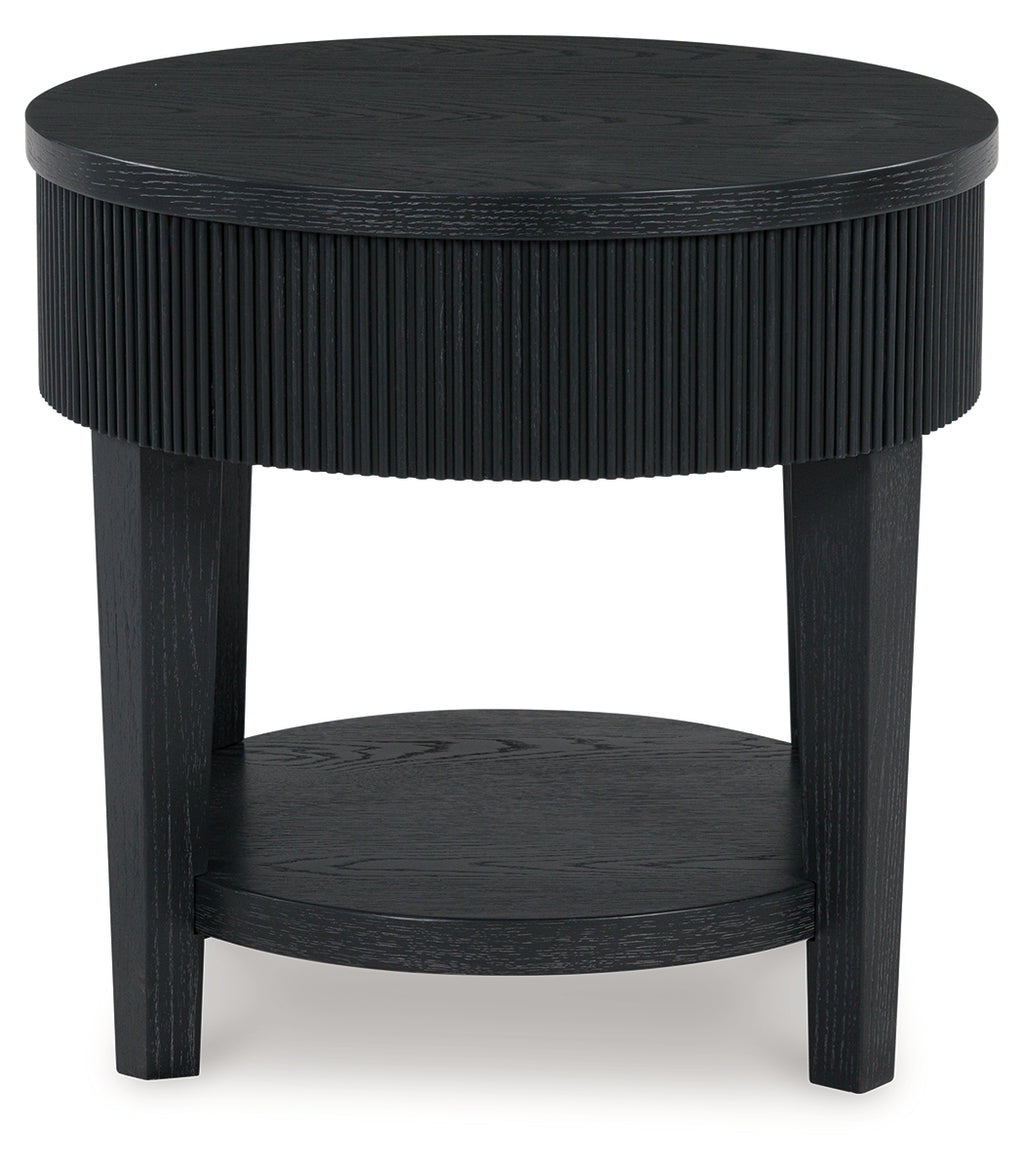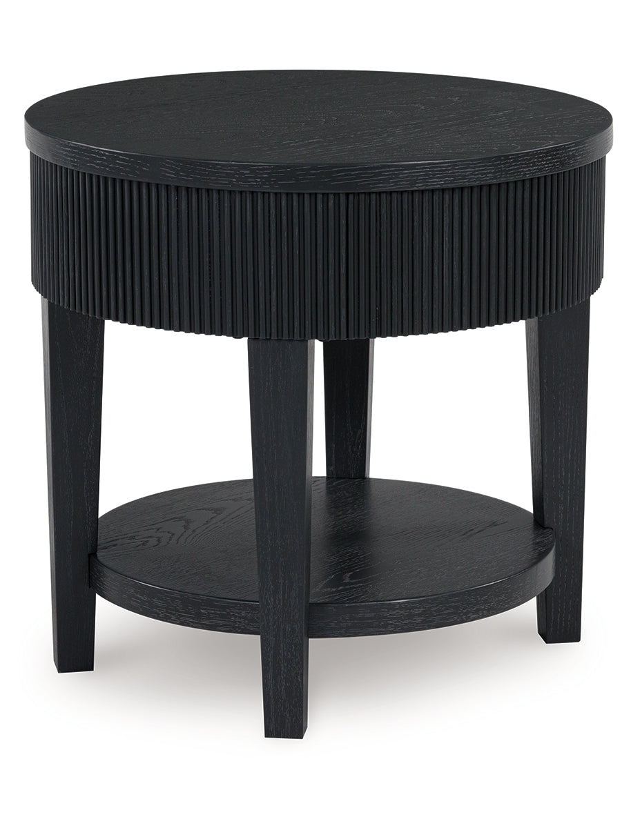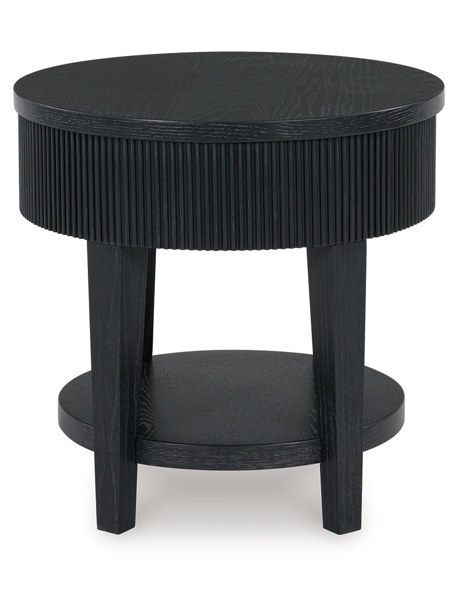 Classic and cool in dark charcoal, this end table brings contemporary convenience to your living room. Short on storage? The trendy reeded apron conceals a drawer perfect for remotes, controllers and other entertainment accessories. What a perfect marriage of style and functionality. | Product Features
