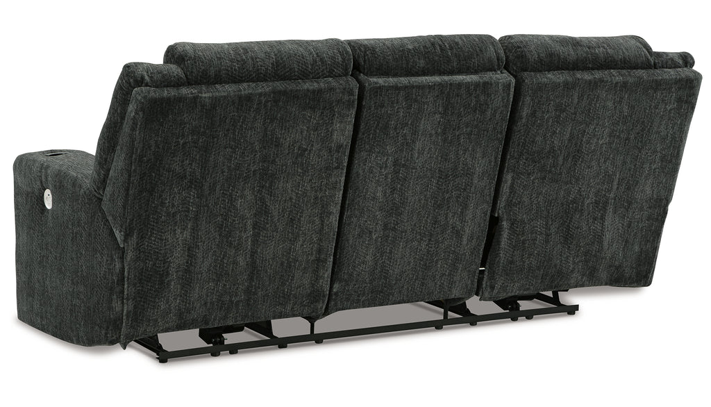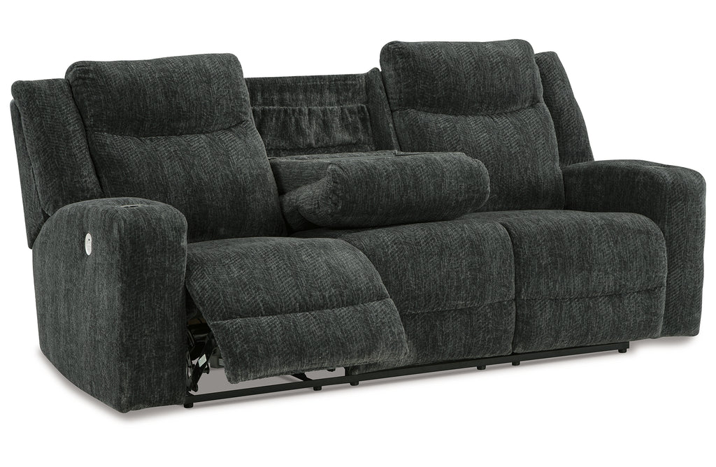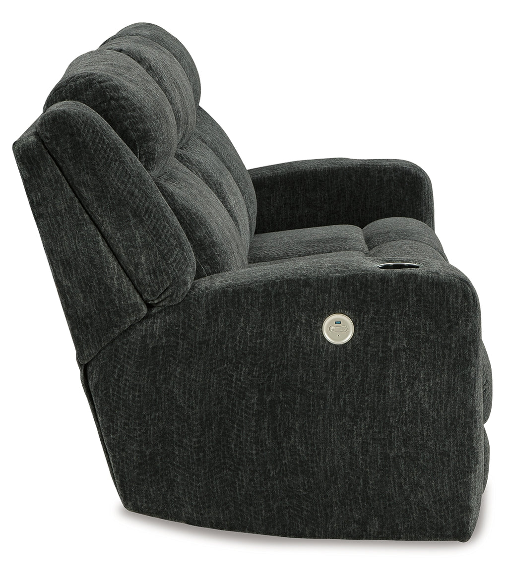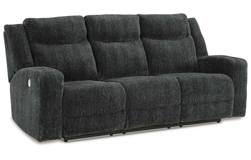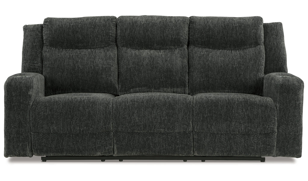 Ideal for those who seek synergy of form and function, this power reclining sofa with drop-down table is made for everyday indulgence. Its motion features are decidedly modern; the upholstery velvety soft. A versatile, dark neutral hue takes you back to style basics. Track arms frame the chunky profile, completing this relaxed approach to contemporary decor. | Product Features