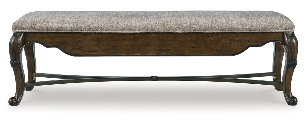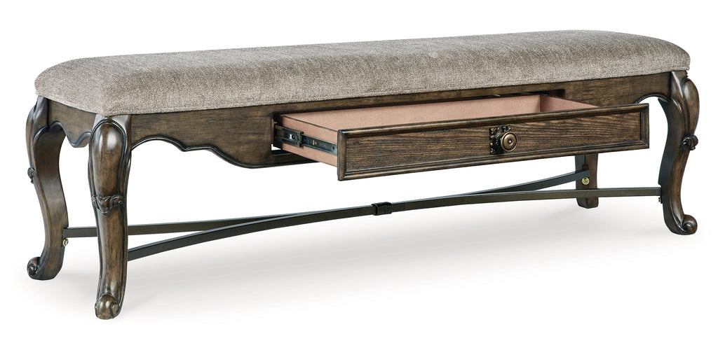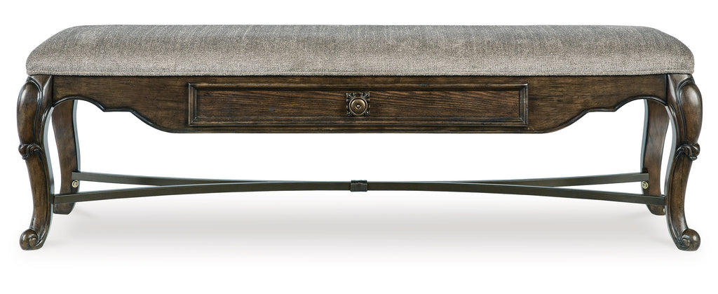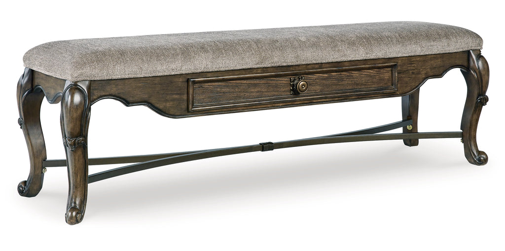 From its ornamental appliques to its large scale, this dining bench makes a bold statement. With ornately shaped legs, a plush cushioned seat and a storage drawer, the opulent bench wows with stunning style. The look is timeless. The feel? Right at home. | Product Features