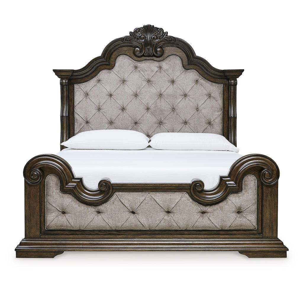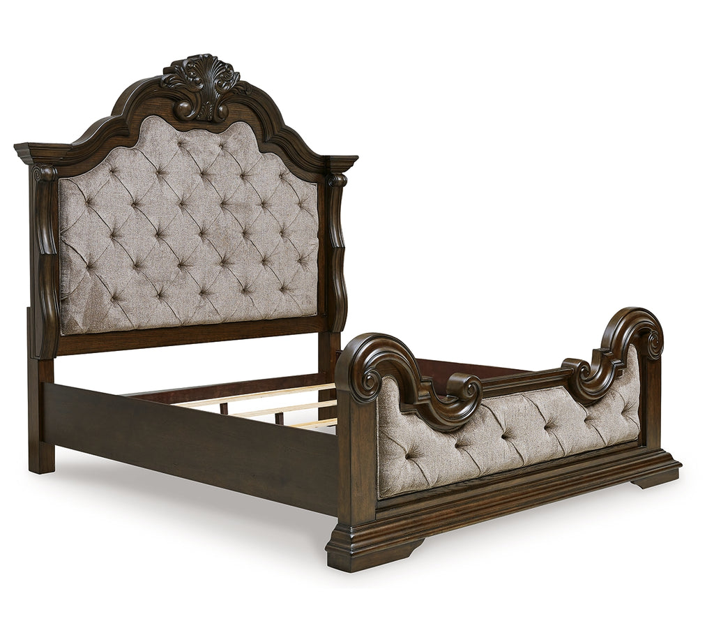 From its ornamental appliques to its large scale, this California king upholstered bed makes a bold statement. Showcasing sculptural ornate details and button tufting, this opulent bed wows with stunning style. The look is timeless. The feel? Right at home. | Product Features
