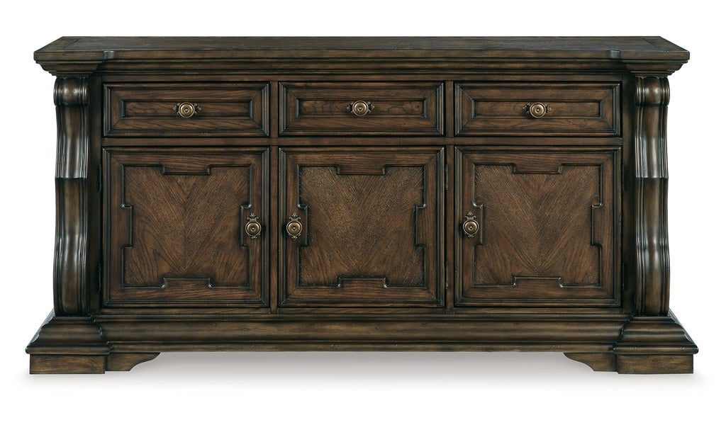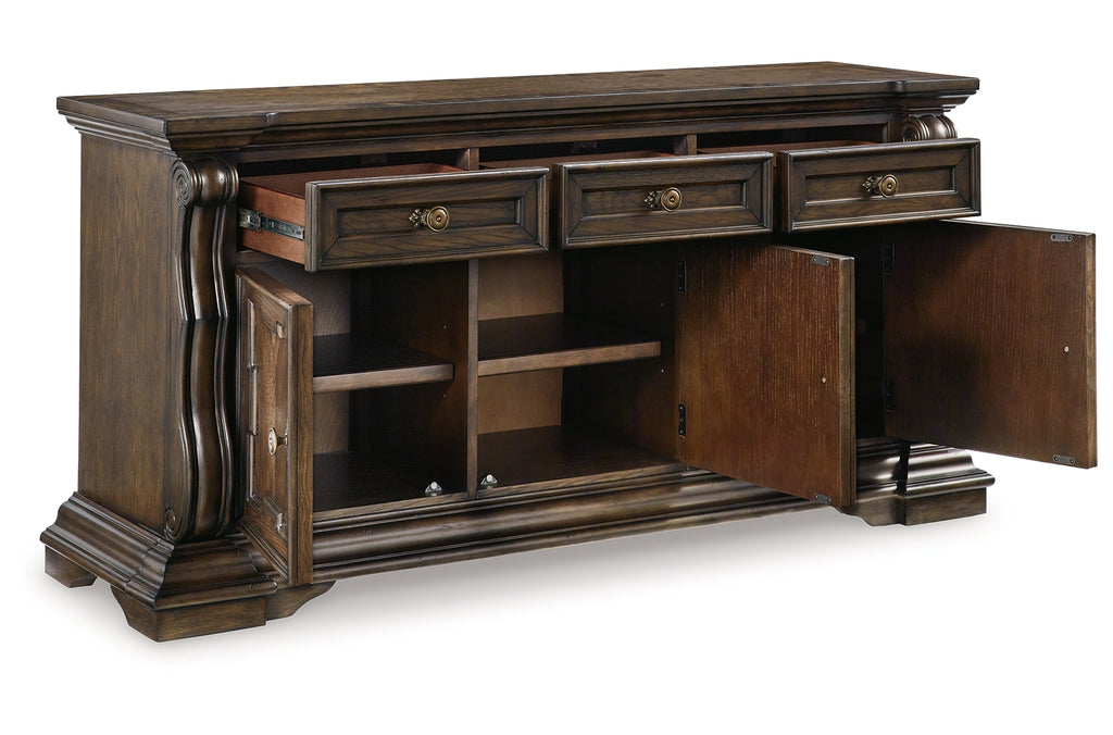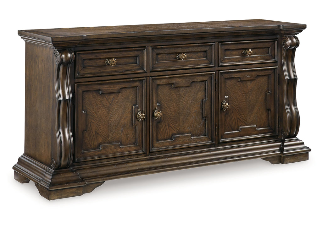 From its ornamental appliques to its large scale, this dining buffet makes a bold statement. With multiple cabinets and drawers to store necessities, the opulent piece wows with stunning style. The look is timeless. The feel? Right at home. | Product Features