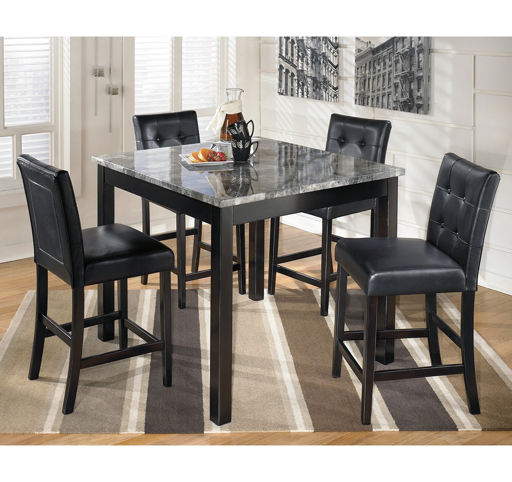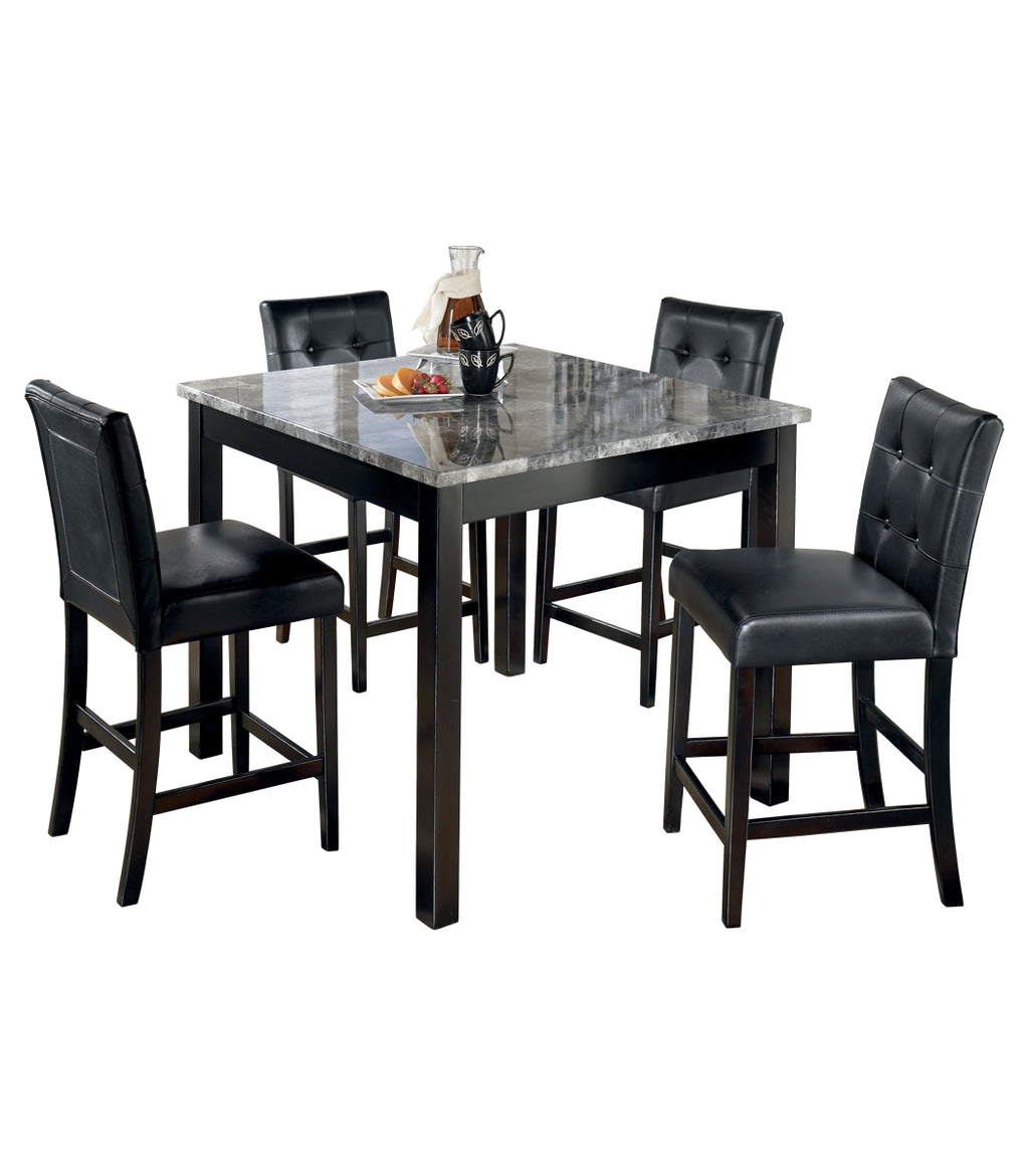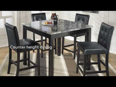The square shape of this counter height table offers comfortable dining without taking up too much space. Faux marble tabletop has a polished look that's easy to clean. Cushioned counter stools are tufted and covered in faux leather and slide neatly under the table when not in use. | Product Features