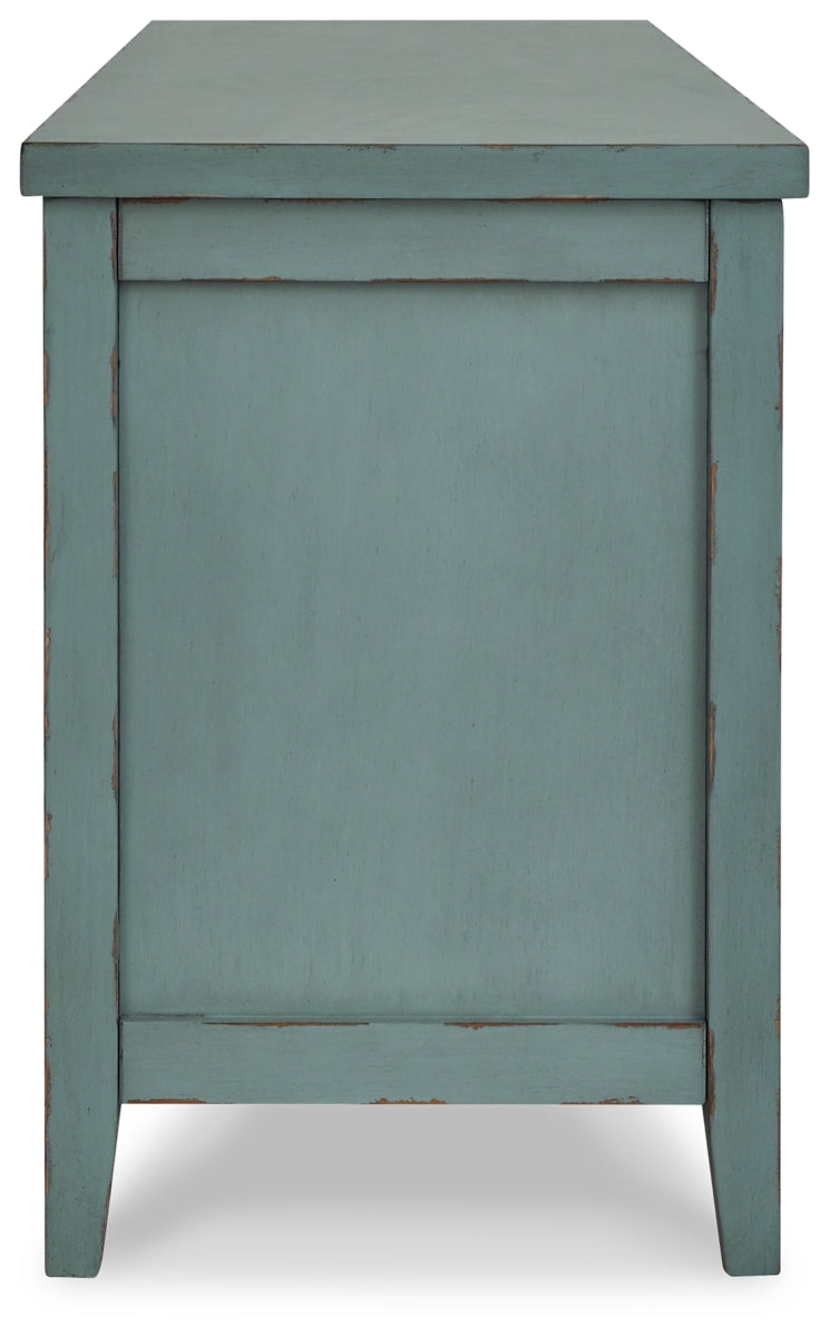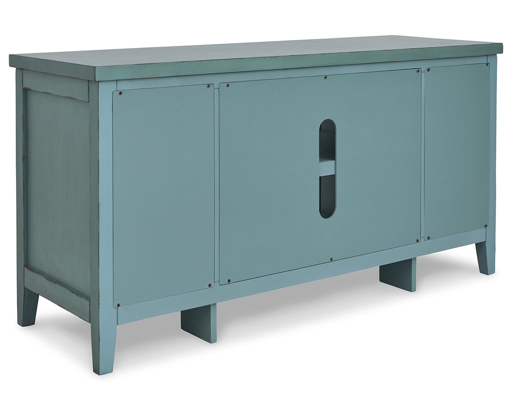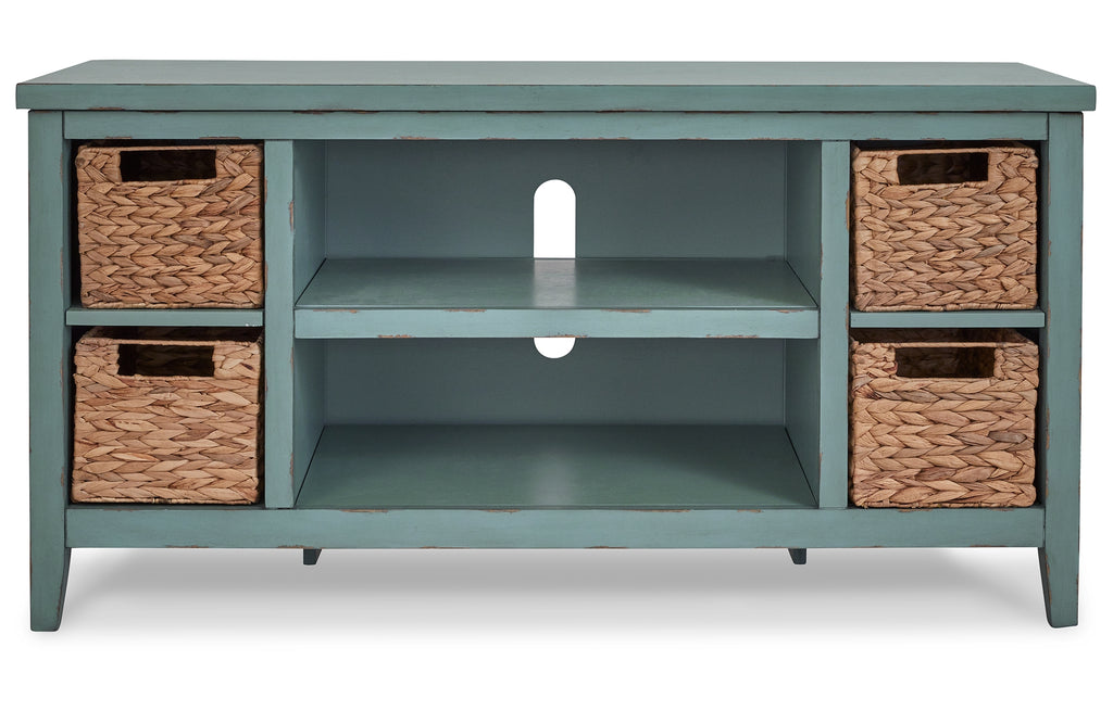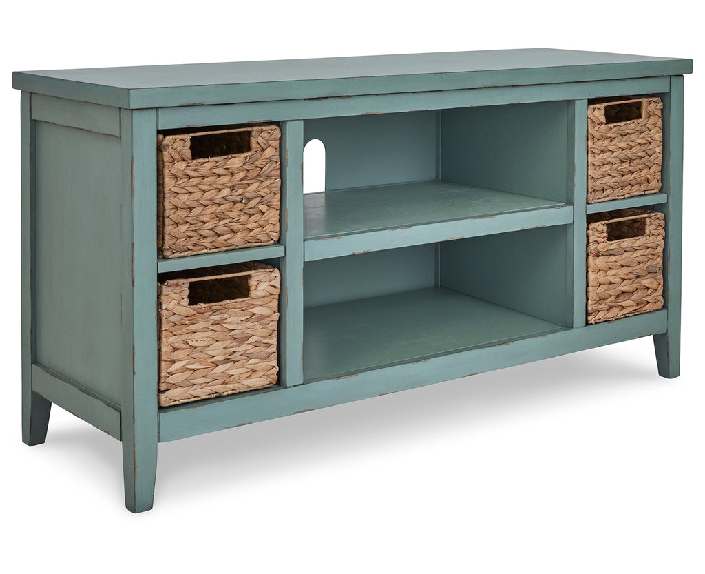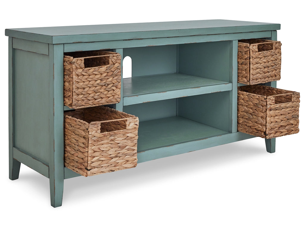 Bring the vintage casual vibe you love to the living room with this TV stand. A stylish storage solution in a teal finish, this charming piece completes your entertainment area with ease. Open shelves and the included handwoven baskets provide an effortlessly beautiful look with endless possibilities. | Product Features