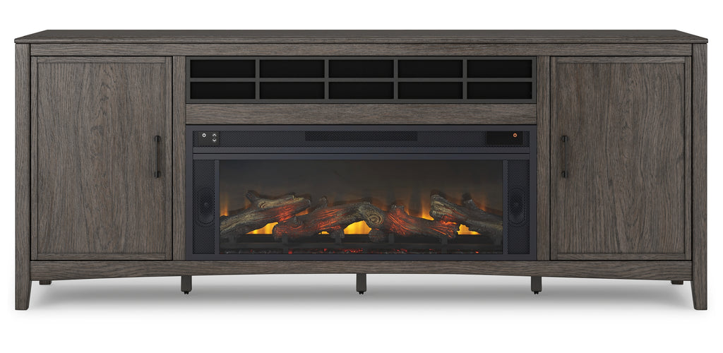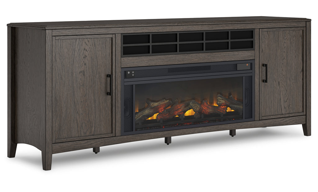 Bring a touch of warmth and beautiful ambiance to your living room. Cool and clean, yet warm and inviting. This TV stand with fireplace insert has so many standout qualities, making it an inspired choice for your dream decor. A prime example of “casual contemporary” style at its very best, the designer piece is dressed to impress in a medium gray-brown finish with a blackened wood grain contrast. Spacious cabinets and shelves are ideal for storing items like your e-reader, TV remotes and other entertainment must-haves. The decorative grille on the upper shelf can conceal a soundbar for a sleek look.