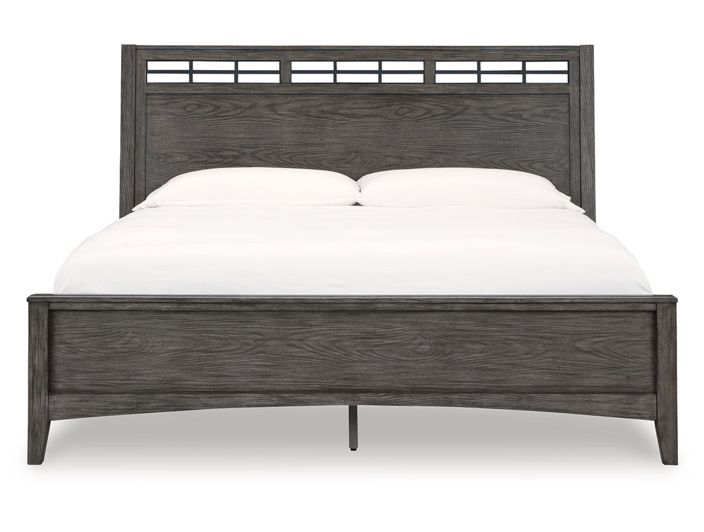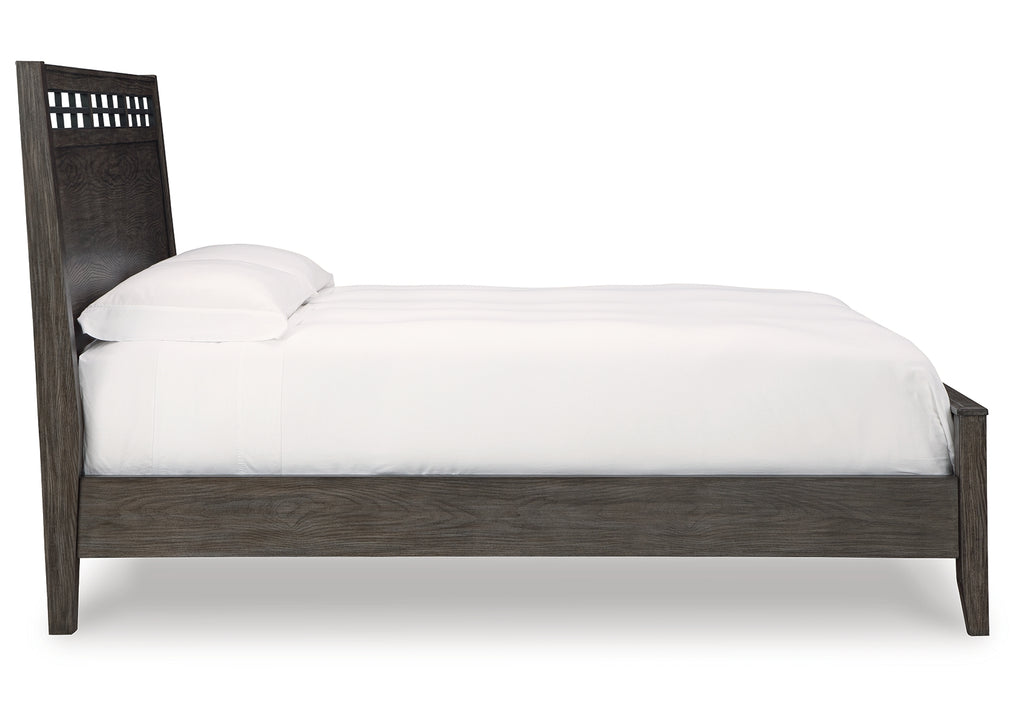 Cool and clean, yet warm and inviting. This queen panel bed has so many standout qualities, making it an inspired choice for your dream destination. A prime example of “casual contemporary” style at its very best, this designer bed is dressed to impress with an embossed wood grain texture. The subtly slanted headboard lets you sit comfortably when reading or working on your laptop in bed. And the medium gray-brown finish with a blackened wood grain contrast is wonderfully easy on the eyes. | Product Features