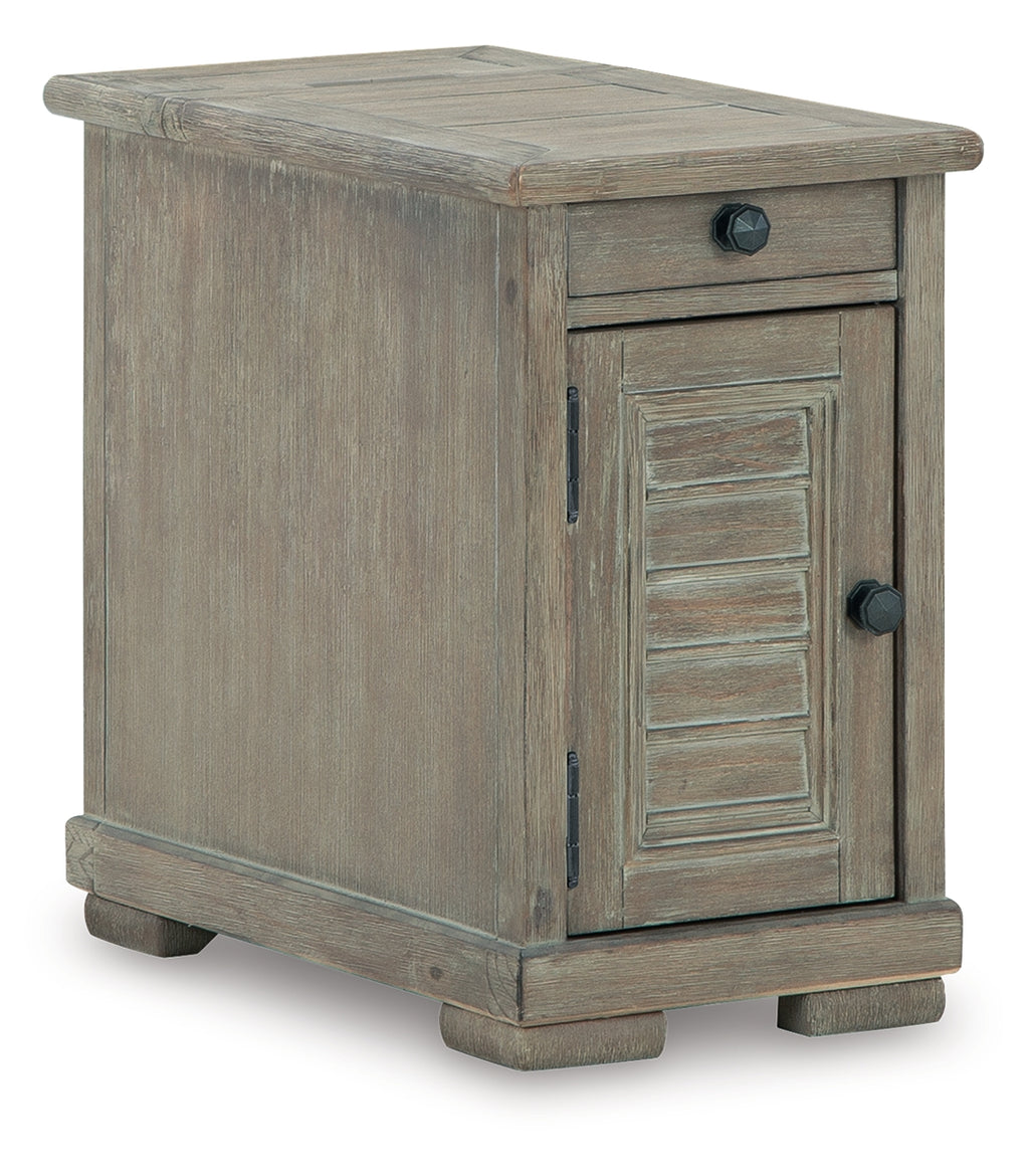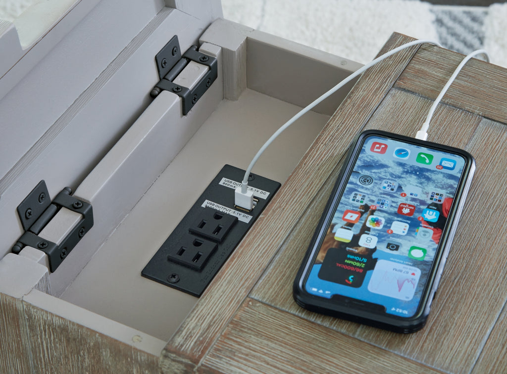 Lighten the look of your living space. This chairside end table offers a casual traditional aesthetic, with natural wood undertones enhanced by a glazed bisque finish and wire-brushed texture. The end table puts it all within reach, with a storage cabinet and pull-out tray. Its built-in power supply and dual USB ports have your charging needs under control. | Product Features