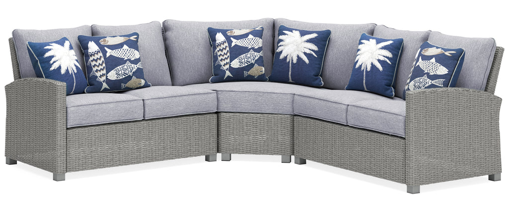 Indulge in backyard bliss. This outdoor sectional has a straightforward sense of style with its light gray resin wicker and wood-look finish. Gray high-performance Nuvella+™ fabric covers the seat and back cushions, weathering the elements and keeping your aesthetic casually cool.