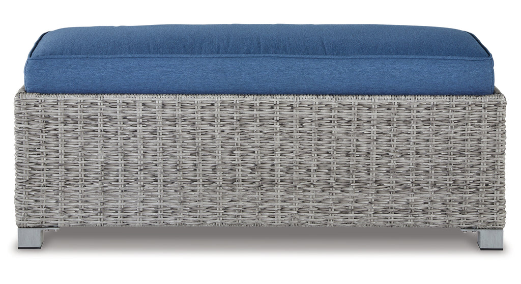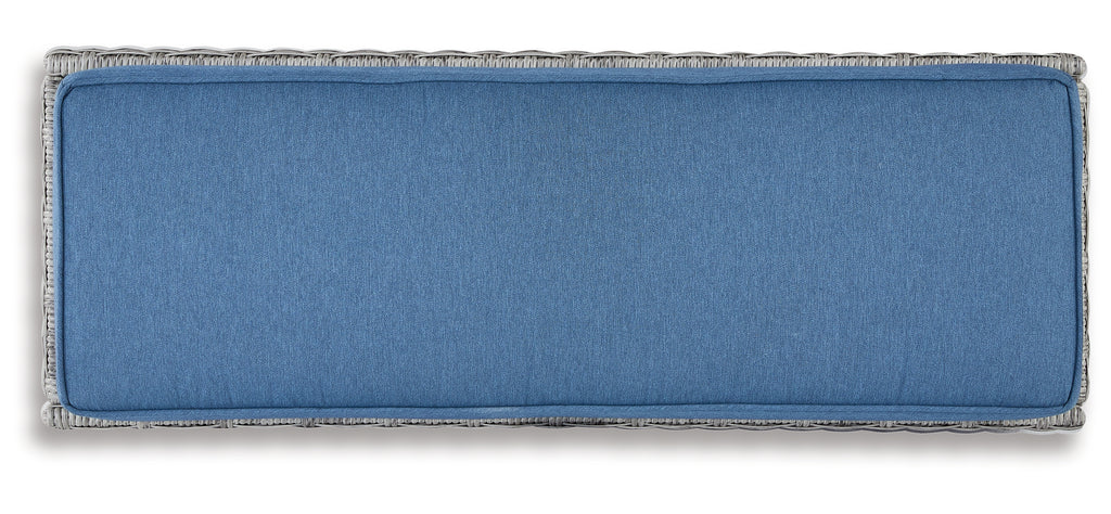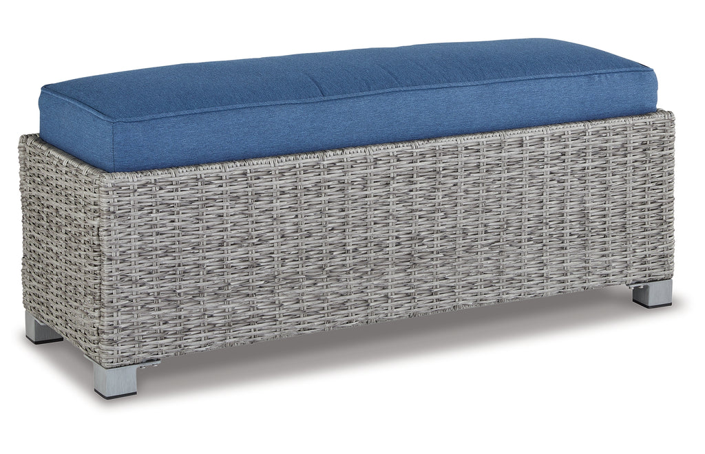 Indulge in backyard bliss. This outdoor bench has a straightforward sense of style with its light gray resin wicker and wood-look finish. Blue high-performance Nuvella+™ fabric covers the cushioned top, weathering the elements and keeping your aesthetic casually cool. | Product Features