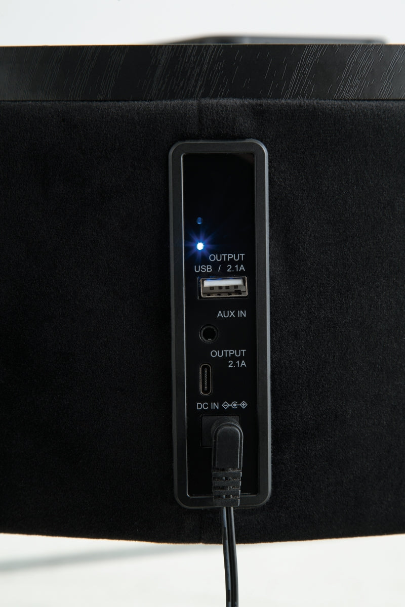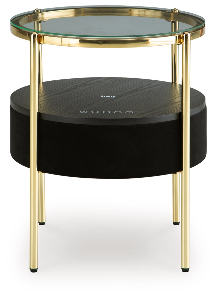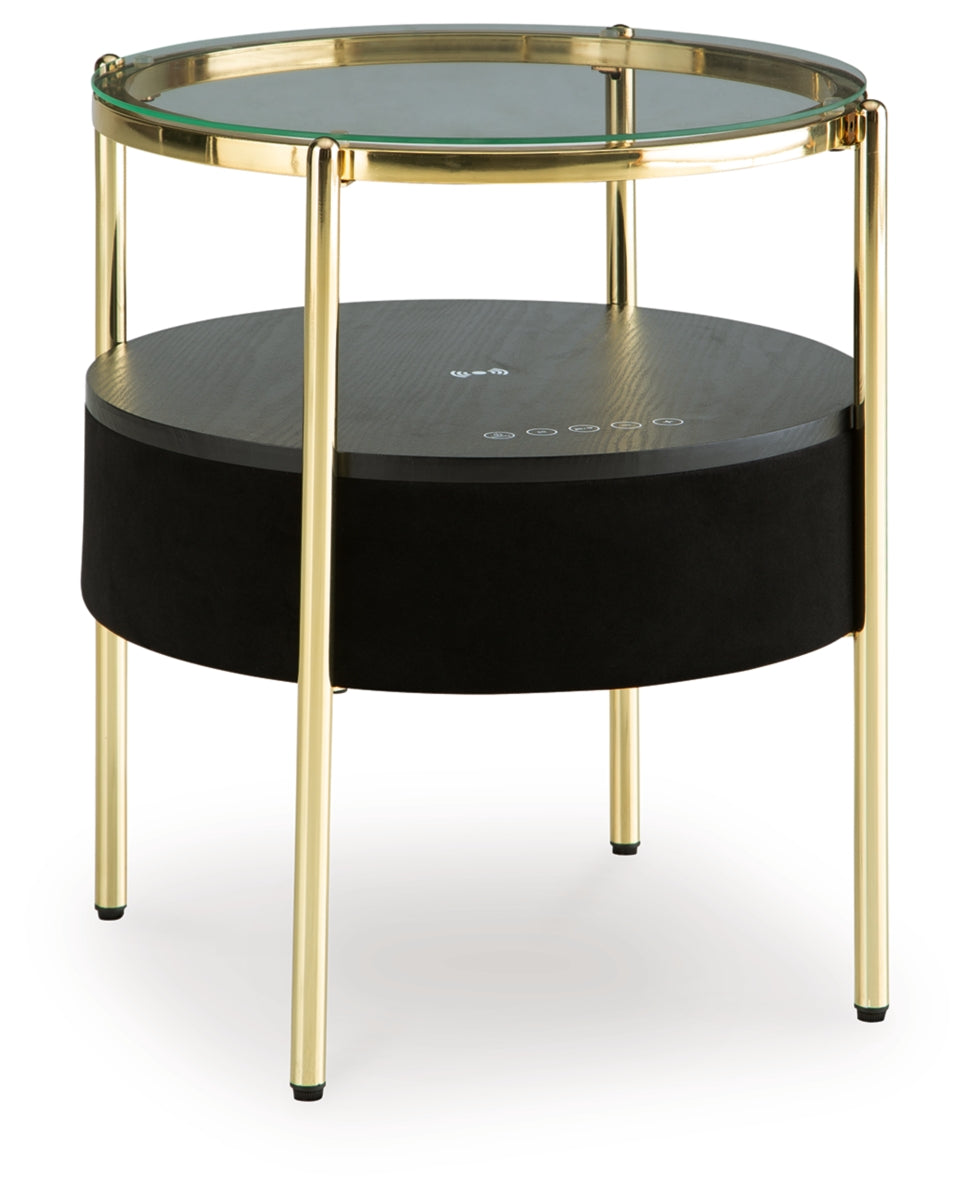 Discover the perfect combination of contemporary style and space-saving functionality. This accent table is designed with an integrated speaker (complete with wireless charging and touch-button controls), allowing you to effortlessly stream your favorite tunes wirelessly. Its sleek glass top perfectly complements the modern black fabric on the sides. This table is gonna be music to your ears. | Product Features