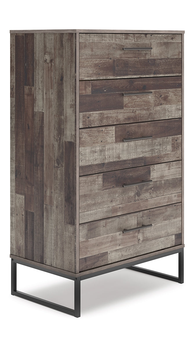 Streamlined design and a stunning finish come together in one simply extraordinary piece. This chest of drawers is sure to impress with five smooth-operating drawers, canted metal legs and a rustic butcher block finish over replicated pine grain texture. Its mid-century style is a nod to the past, while the updated finish keeps it solidly in the present. | Product Features