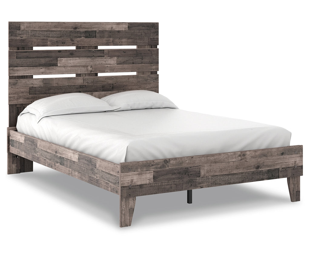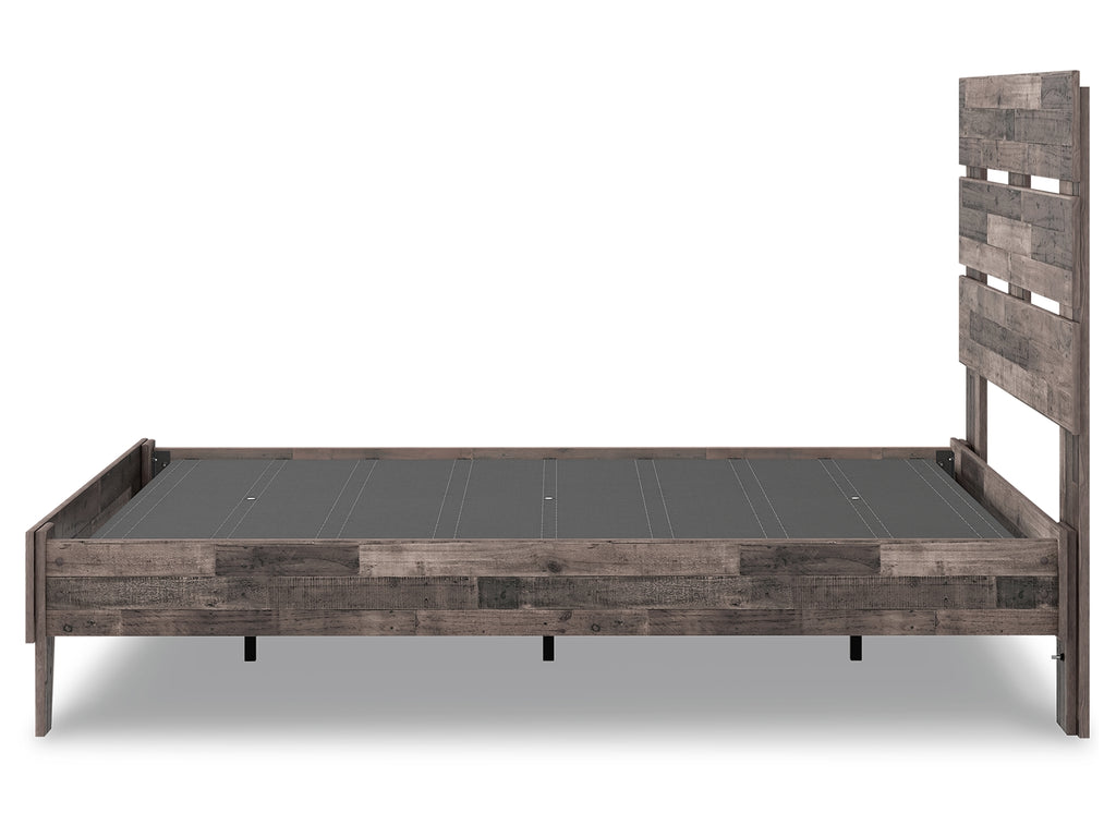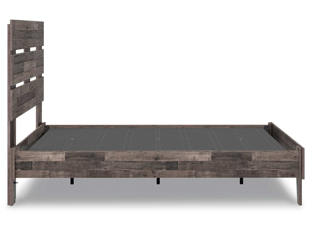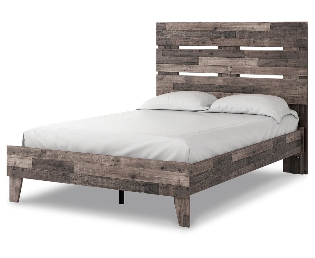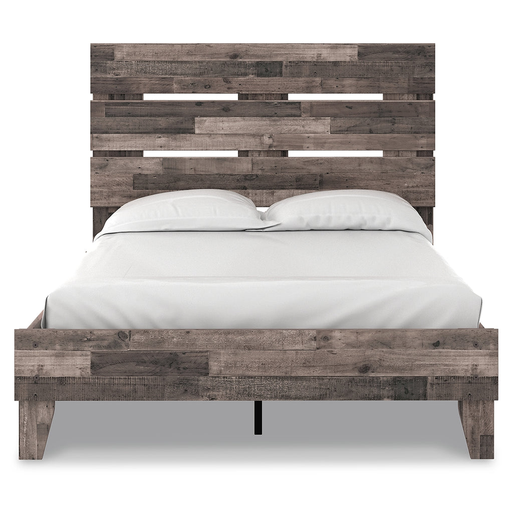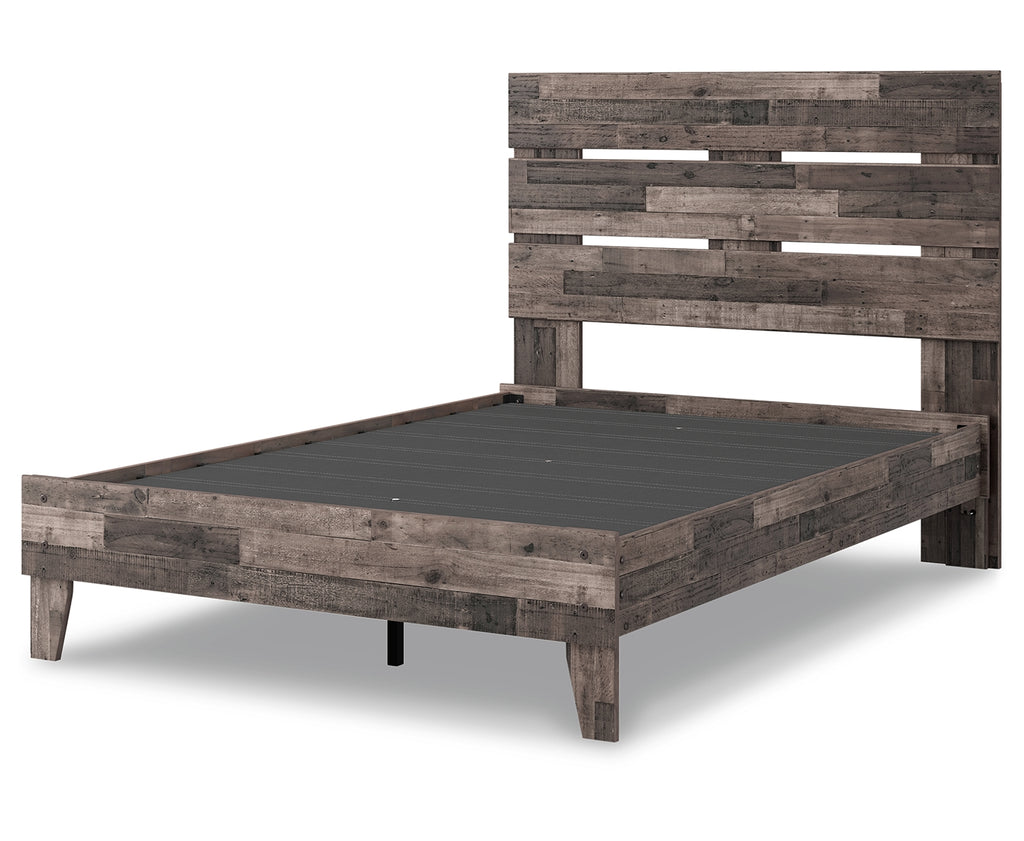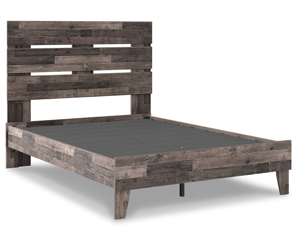 Streamlined design and a stunning finish come together in one simply extraordinary bed. This full panel bed is sure to impress with platform styling and a rich brown finish over replicated pine grain texture. Its mid-century profile is a nod to the past, while the updated finish keeps it solidly in the present. | Product Features