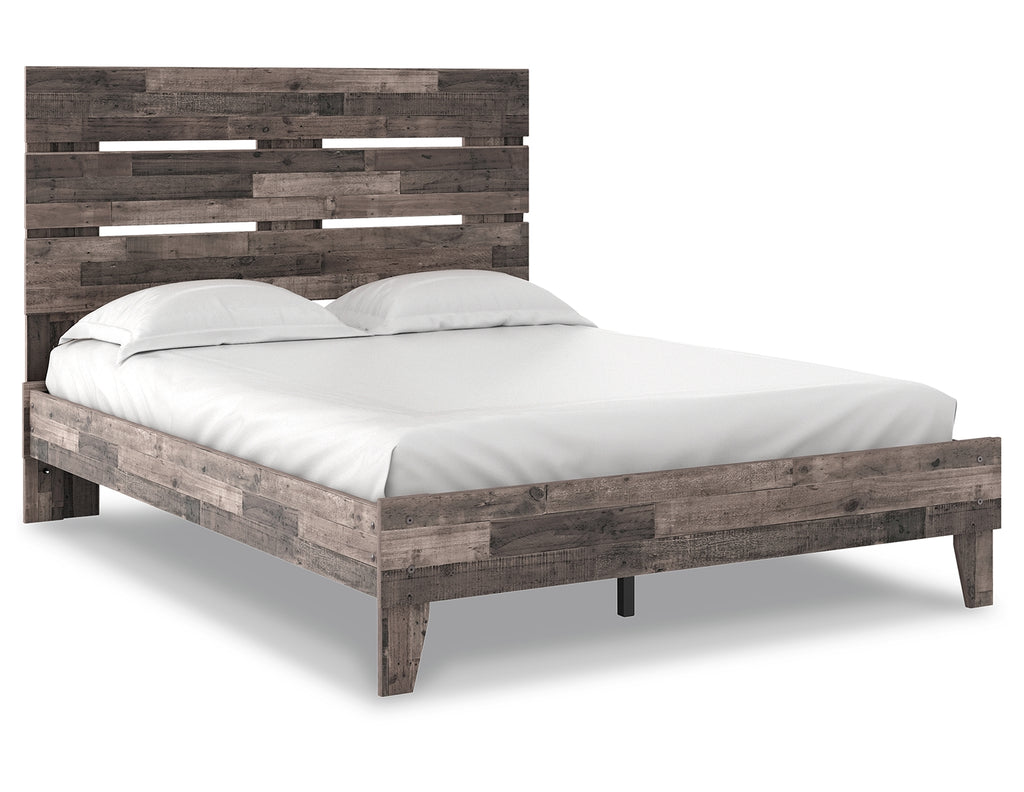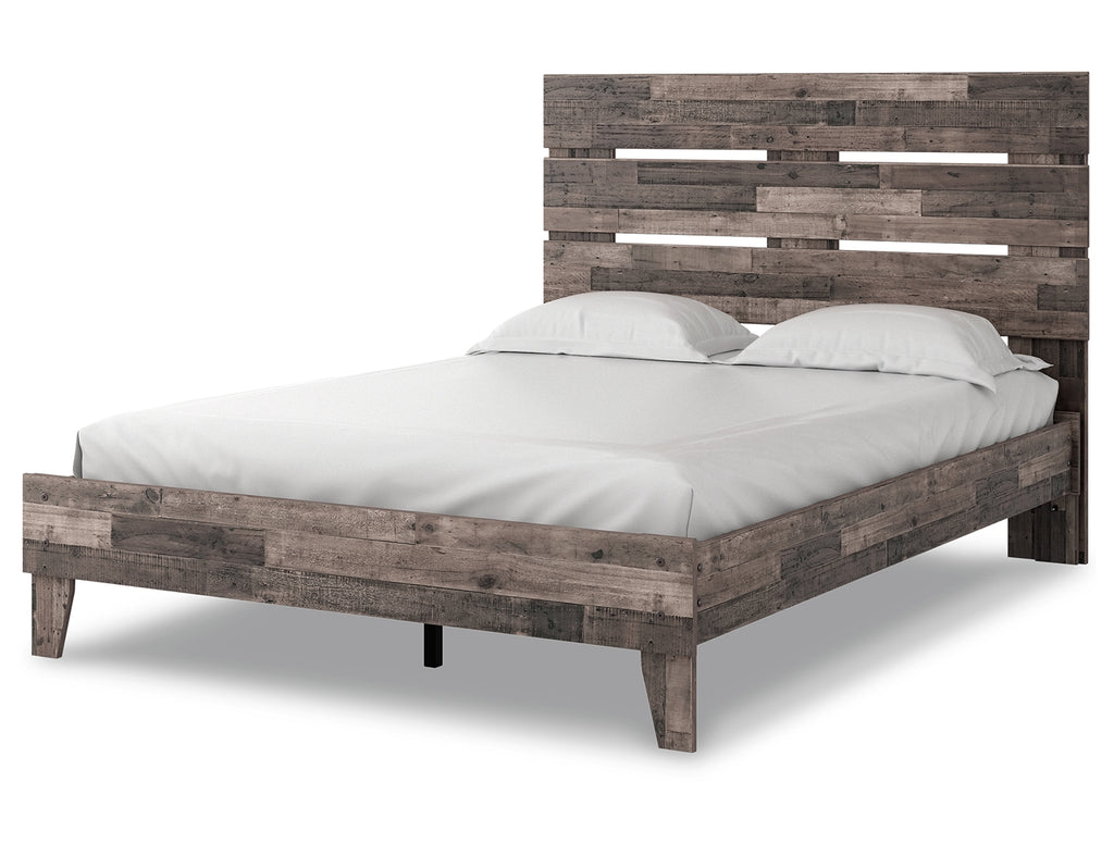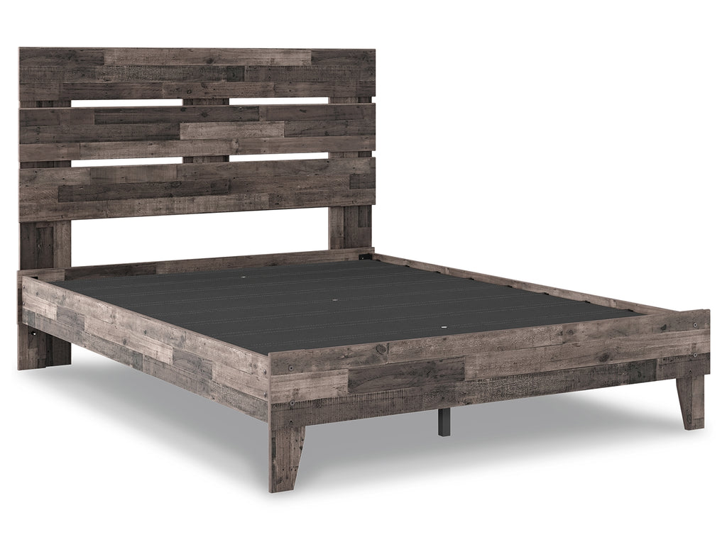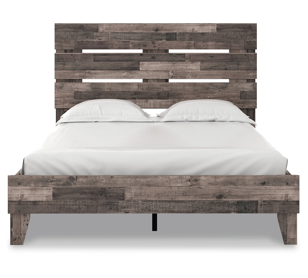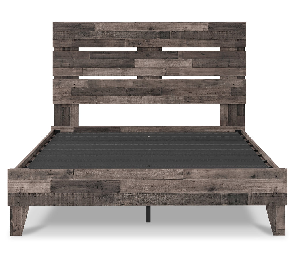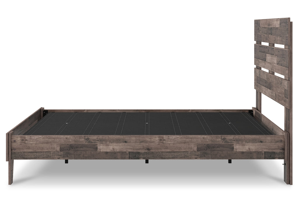 Streamlined design and a stunning finish come together in one simply extraordinary bed. This queen panel bed is sure to impress with platform styling and a rich brown finish over replicated pine grain texture. Its mid-century profile is a nod to the past, while the updated finish keeps it solidly in the present. | Product Features