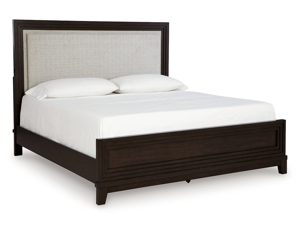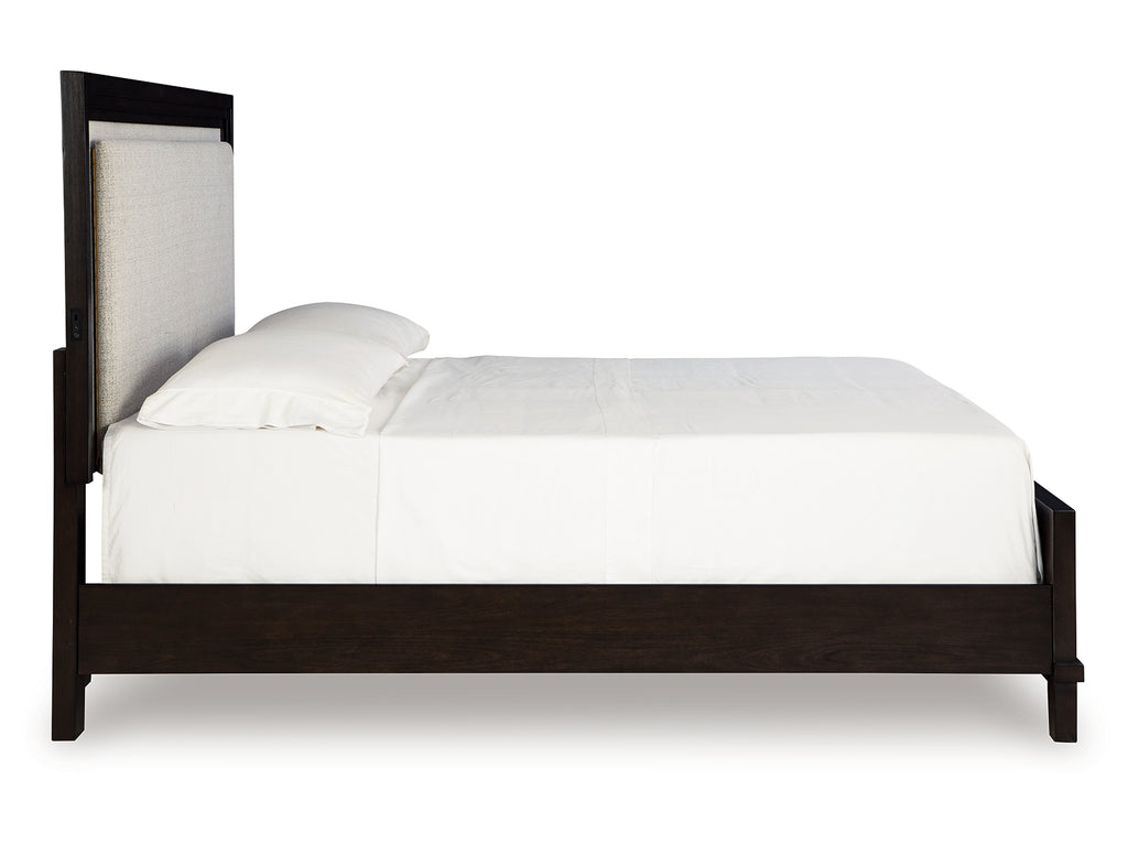- Includes upholstered panel headboard, panel rails and panel footboard with slats