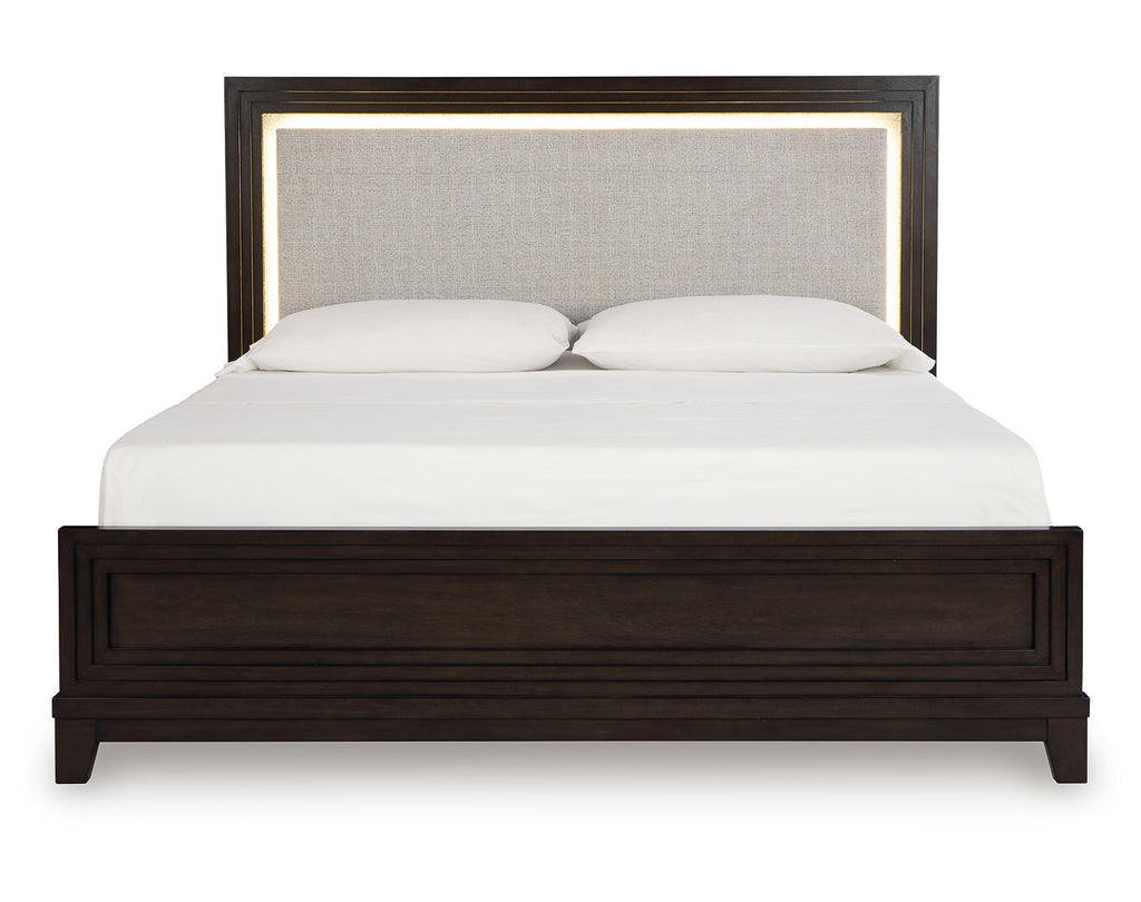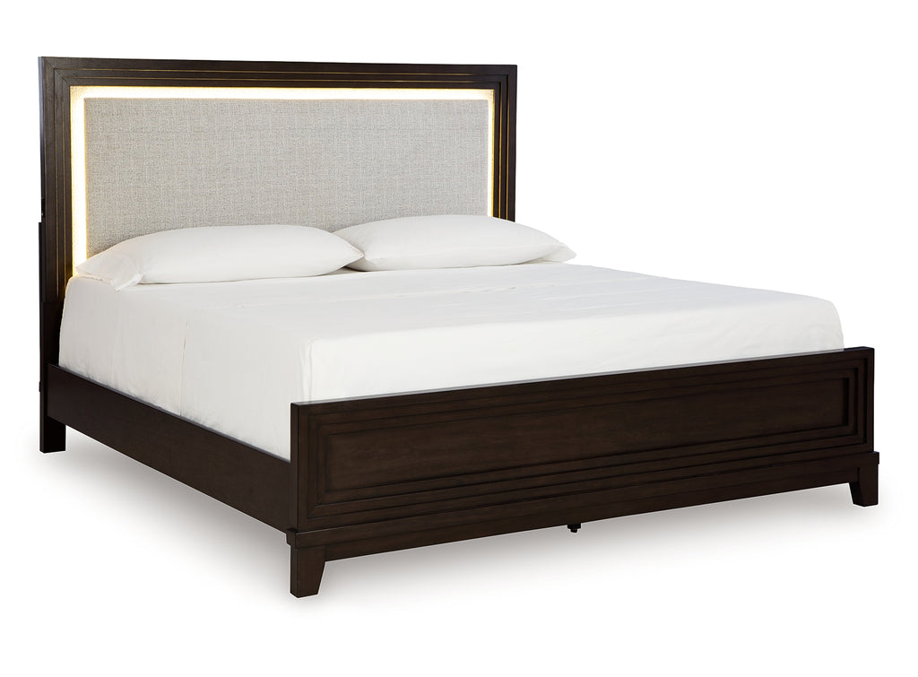 Combining modern and art deco styles, this king upholstered panel bed completes your sanctuary with fashionable functionality. LED backlighting steals the show, highlighting a headboard with all the upgrades you desire—including USB charging and easy-to-clean Nuvella® performance fabric. Indulge in a fresh look that feels right at home. | Product Features