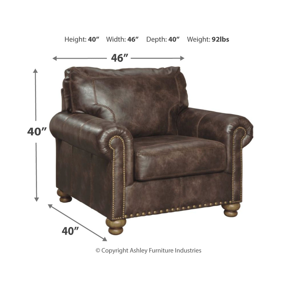 Enticing with a coffee brown faux leather, beautified with a gently weathered effect and designer stitching, this chair merges a richly traditional sense of style with modern comfort. Roll arms, turned bun feet and prominent nailhead trim incorporate distinctive character. | Product Features