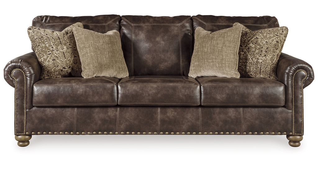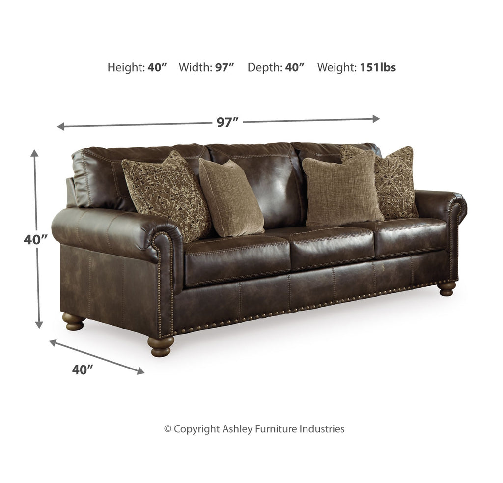 Enticing with a coffee brown faux leather, beautified with a gently weathered effect and designer stitching, this sofa merges a richly traditional sense of style with modern comfort. Roll arms, turned bun feet and prominent nailhead trim incorporate distinctive character. Four plush accent pillows are a sumptuous touch. | Product Features