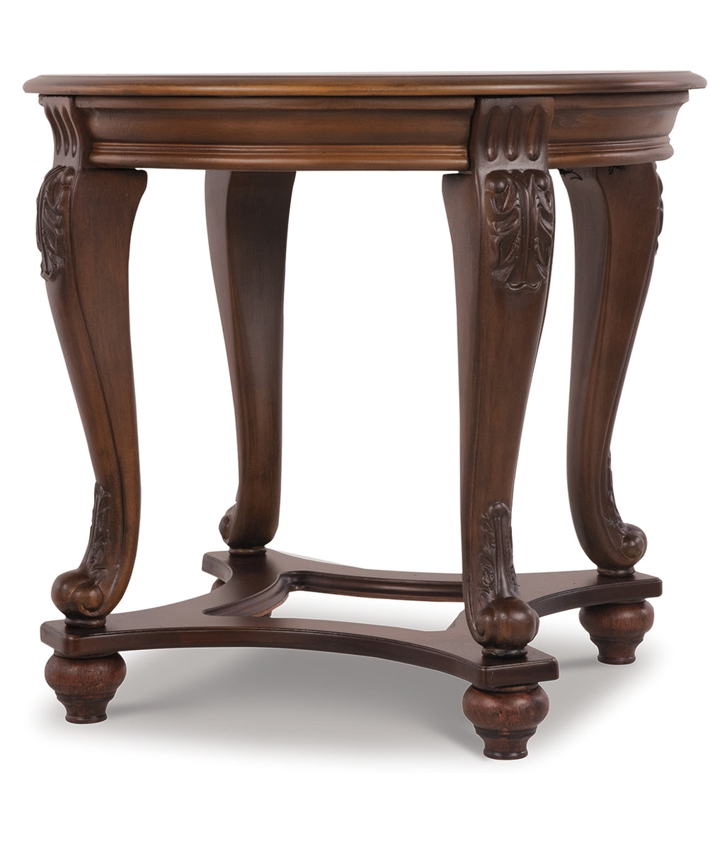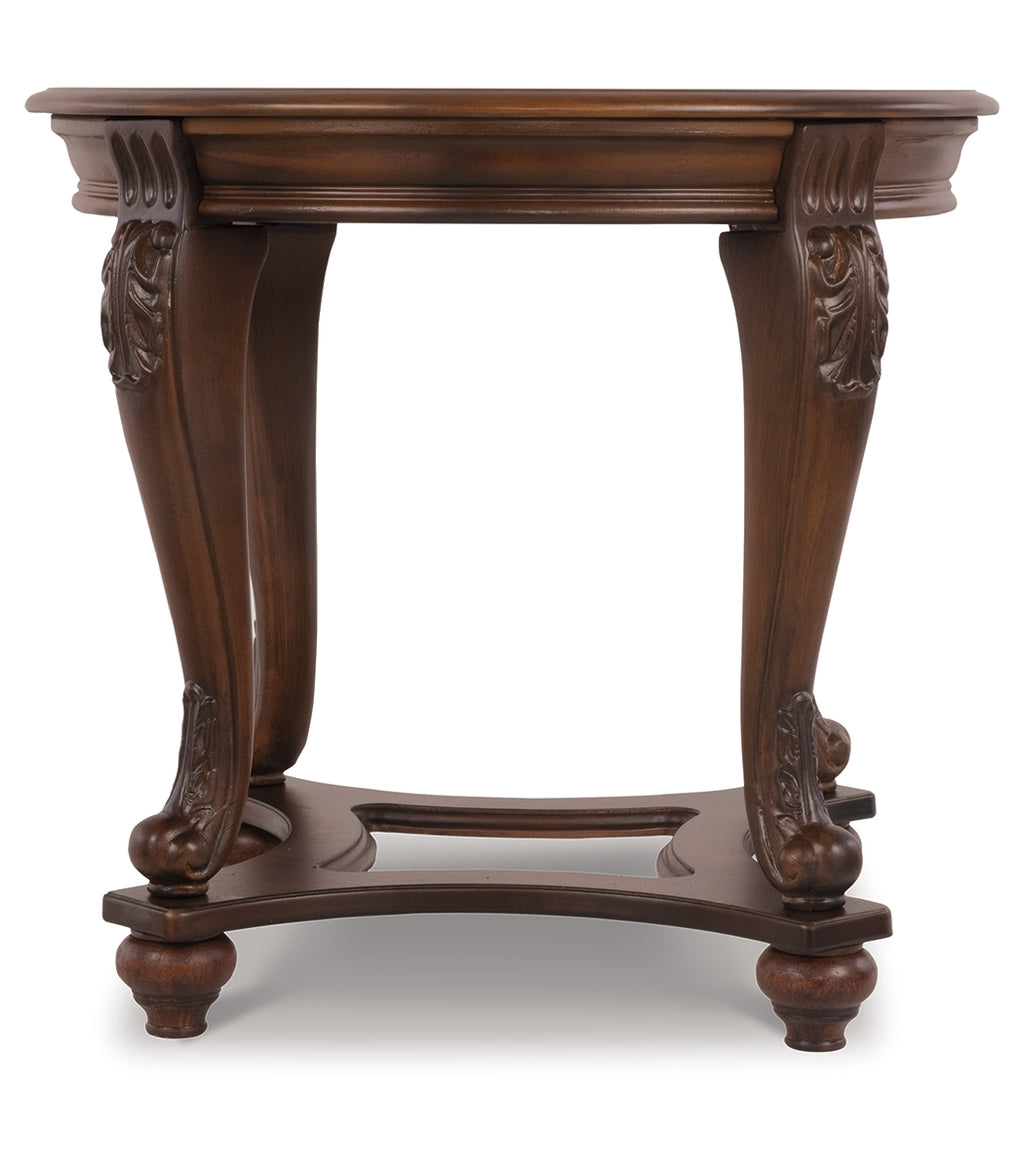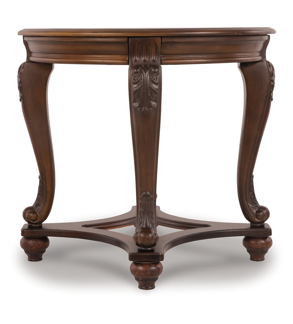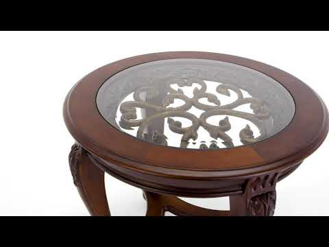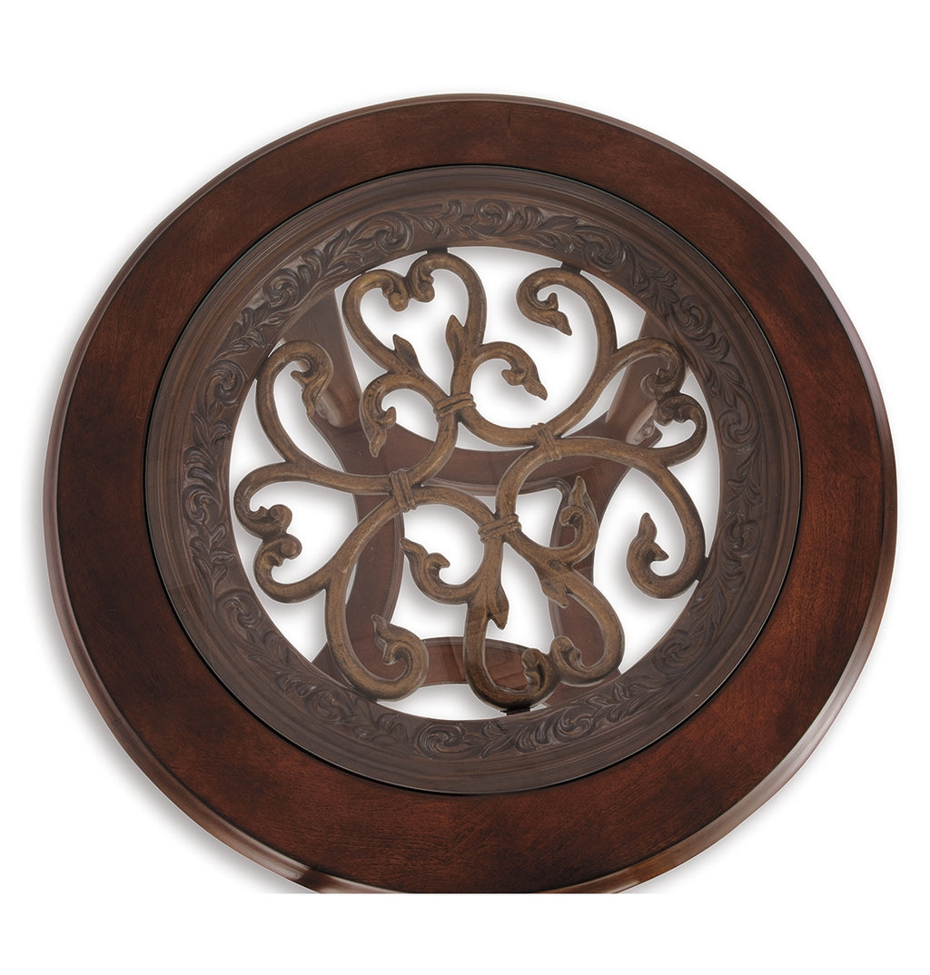 This round end table deserves a toast for incorporating so many elements so seamlessly. Swirls of metal accents add a lovely dimension under a beveled glass inset tabletop. Their fanciful pattern is echoed in the carvings and curves of the richly stained legs and stretchers.