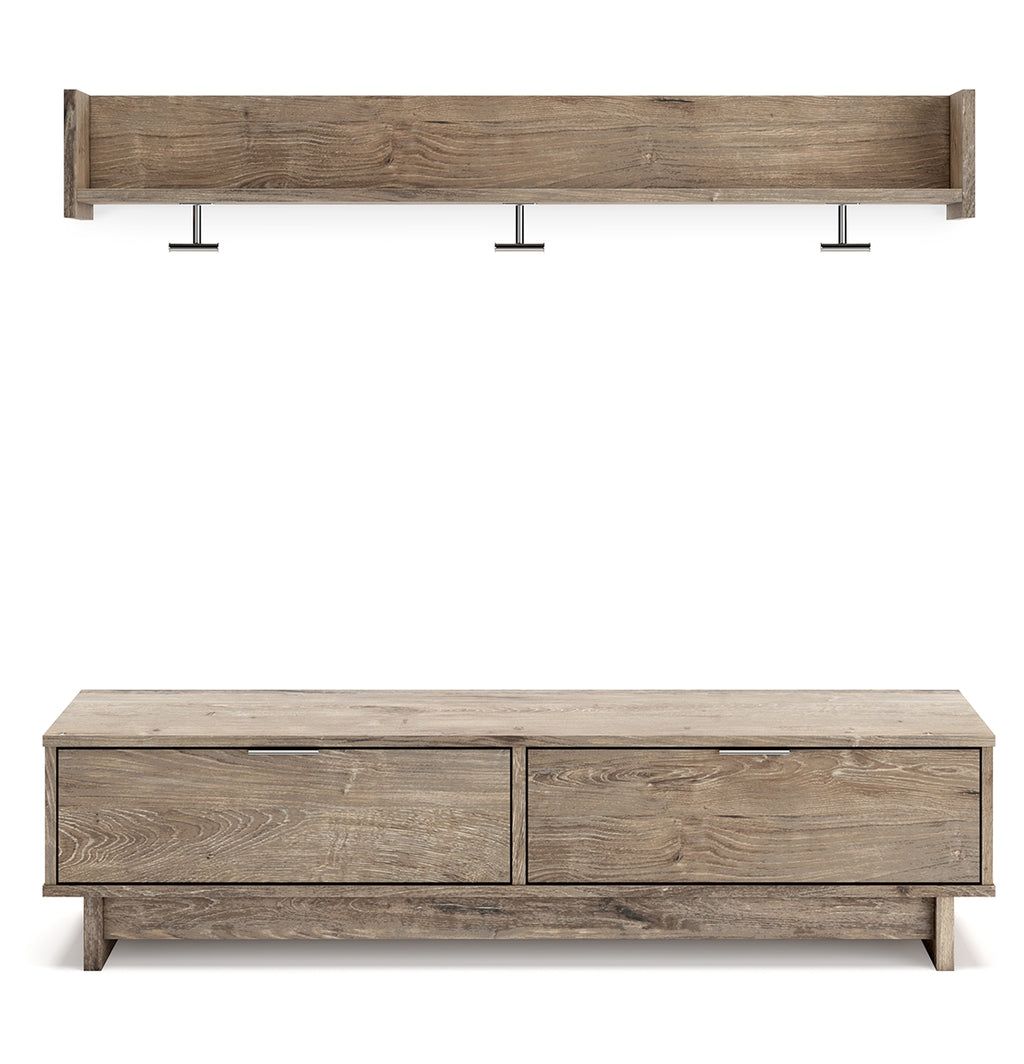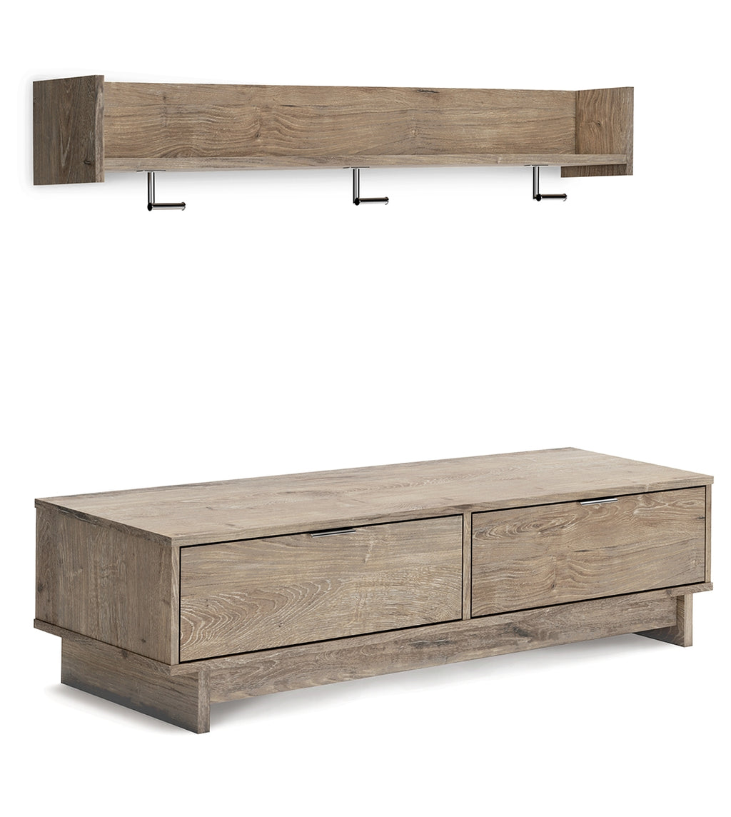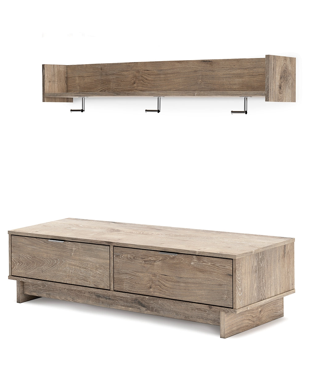 This stylish and versatile storage bench with wall-mounted coat rack are ideal additions to your entryway or mudroom. The dry, light finish with replicated oak grain and authentic touch is accented with brushed nickel-tone pulls as well as hooks on the coat rack for hats and handbags. Two spacious drawers provide endless options for storage while the coat rack features an open shelf for easy access or display. Wall mounting bracket included.