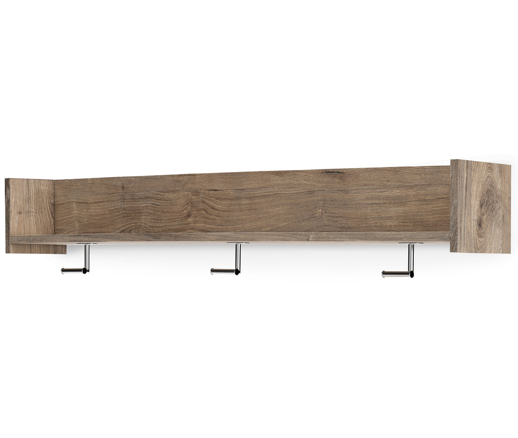 This stylish and versatile wall-mounted coat rack is an ideal addition to your entryway or mudroom. It features an open shelf for easy access or display. A dry, light finish with replicated oak grain is accented with three brushed nickel-tone hooks for hats and handbags. Wall mounting bracket included.