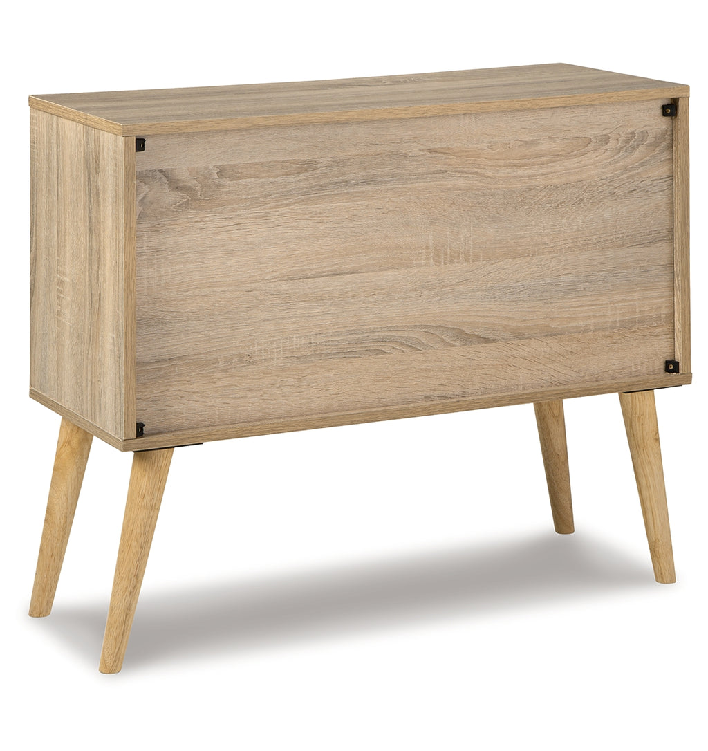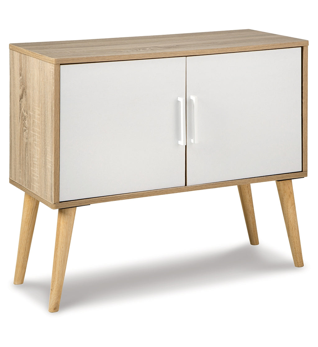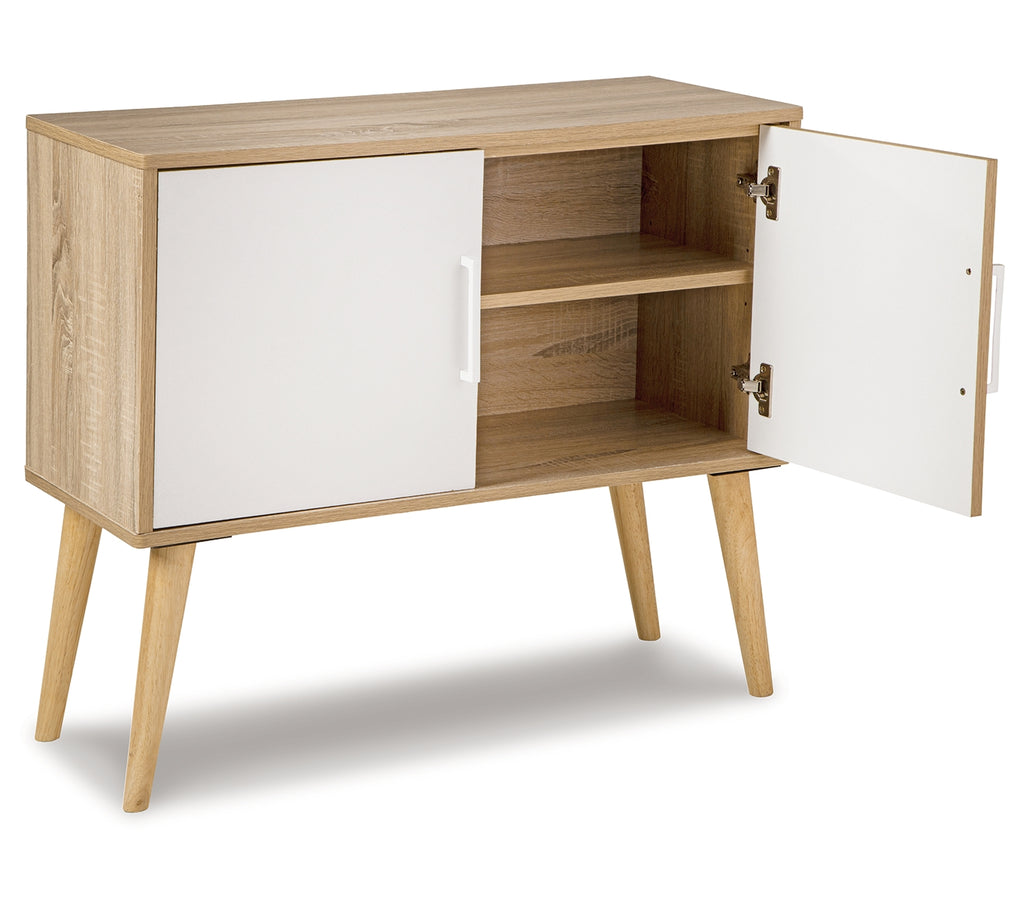 Open the door to clean-lined form and functionality with this accent cabinet. Its homey natural finish is enhanced with crisp white doors and pulls. Adjustable shelf caters to your needs. | Product Features