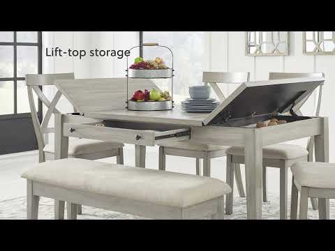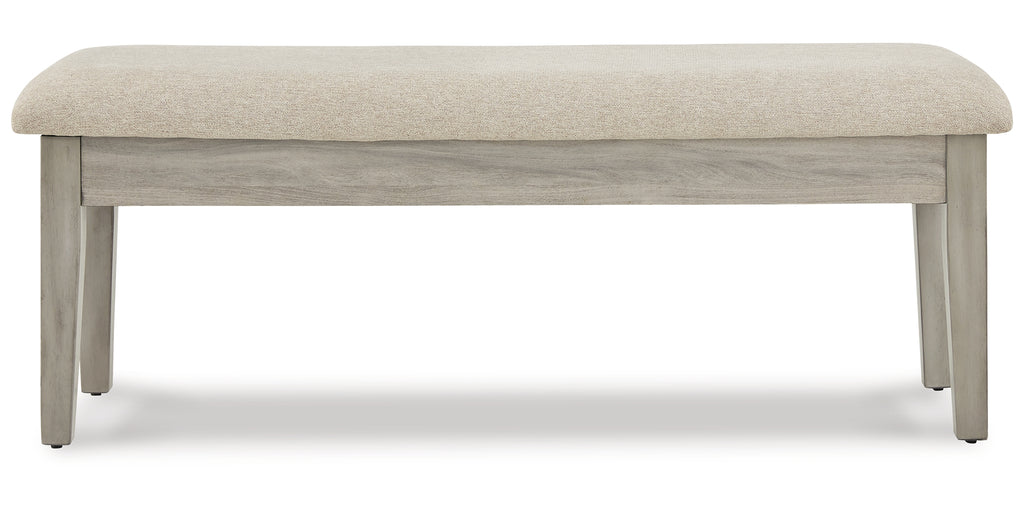 Bring a relaxed-yet-refined sense of good taste to a space with this wonderfully comfortable upholstered dining bench. An inspired choice for modern farmhouse living, its clean-lined frame sports a gray finish that’s so easy on the eyes. The bench's cushioned upholstered seat, covered in a complementary textured beige fabric, goes easy on the body. Tuck your treasures out of sight with hidden storage under the seat. | Product Features